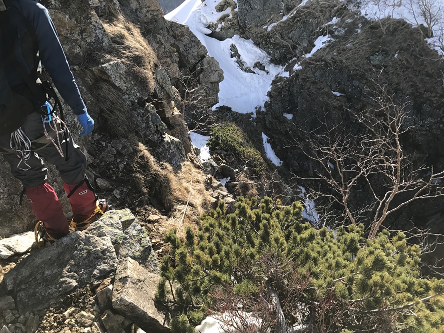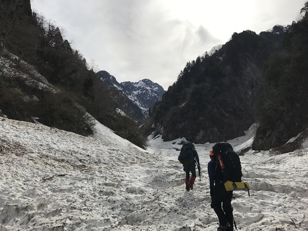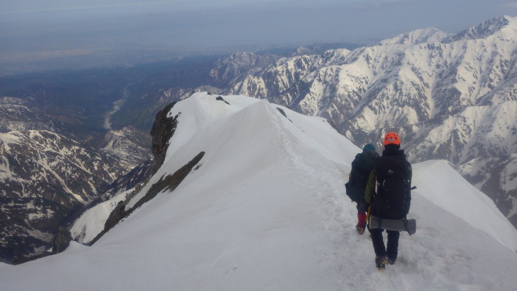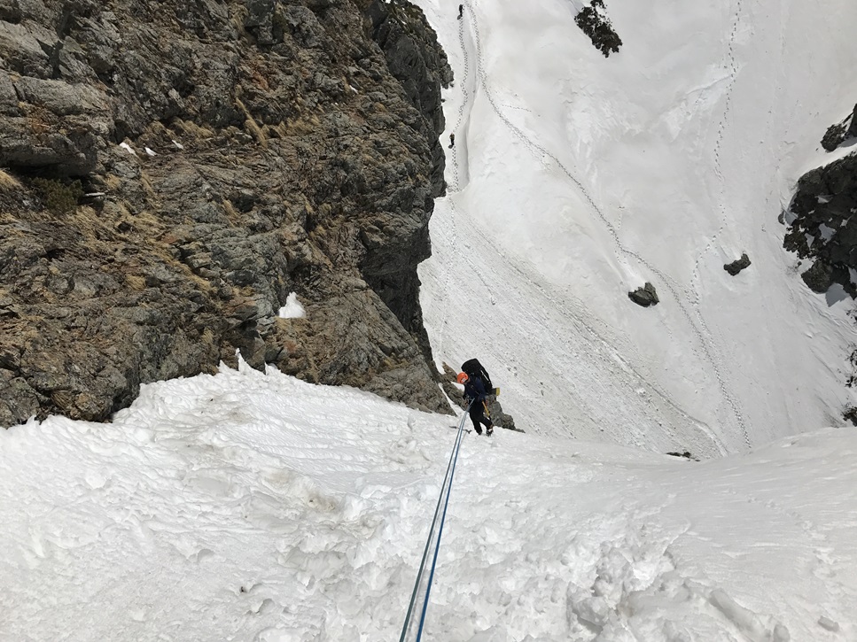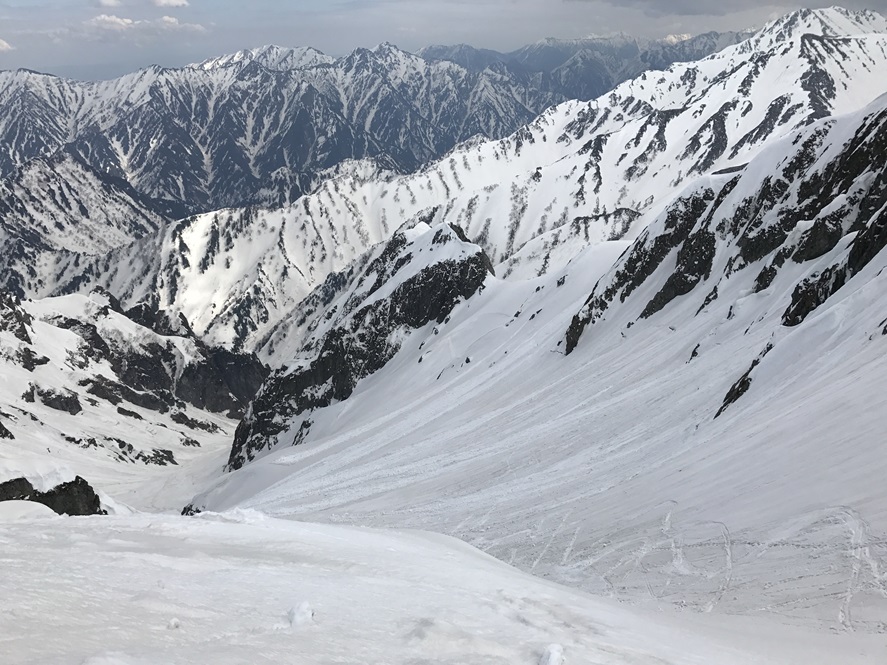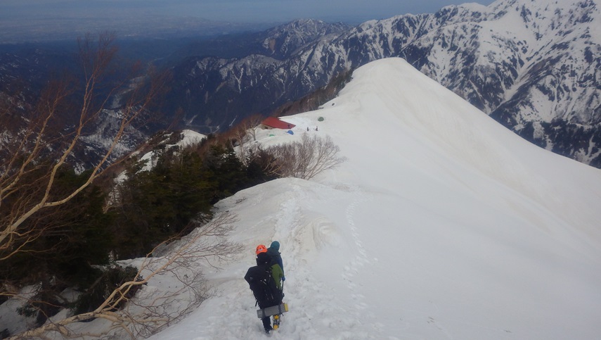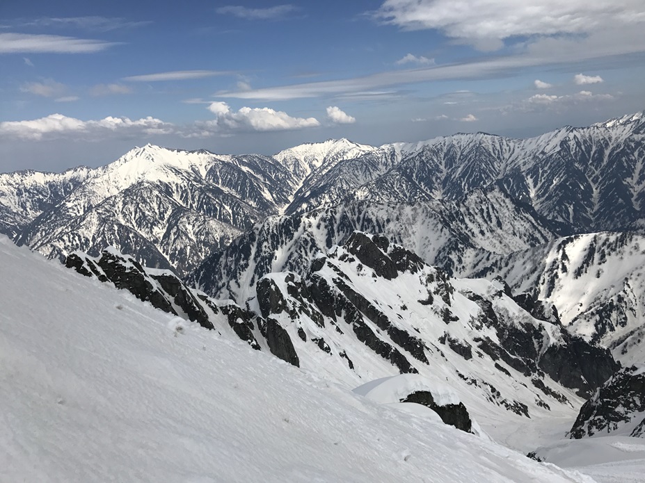 ★コース状況:GWなのでそれなりに人が入っておりトレースはありました。雪質は朝から緩い感じでした。50mロープ×2本を携行して行きましたがロープが必要と迫られるところはなかったように思います。(せっかく持っていったので小窓ノ王脇の雪壁を下る時に懸垂下降で使いましたが・・・)ただしミスすれば大怪我以上というところはしょっちゅう出てくるのでパーティーの技量に合わせてロープを出すことは必要だと思います。早月尾根上部は侮れない下りもありますが、早月小屋より下は雪が付いていると快適に下れます。
