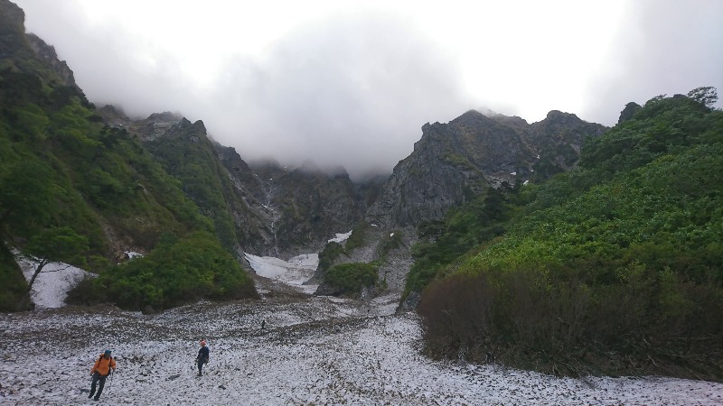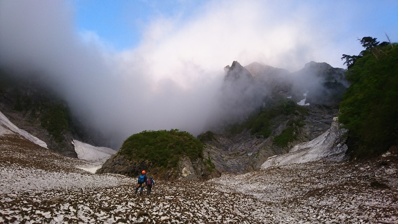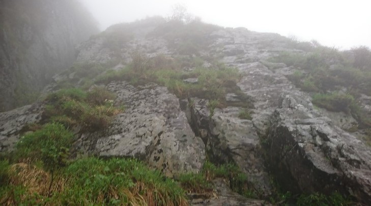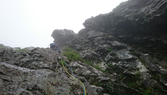 ★コース状況:テールリッジ付近から雨が当たり始める。登攀中は終始雨、特に草原を歩くピッチ辺りから本降り、ここから 安全第一で登り始める。最終ピッチはかなり雨だと辛い。6ルンゼからの下降は特に問題なし。
