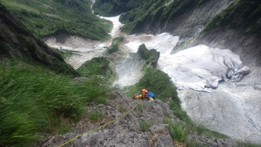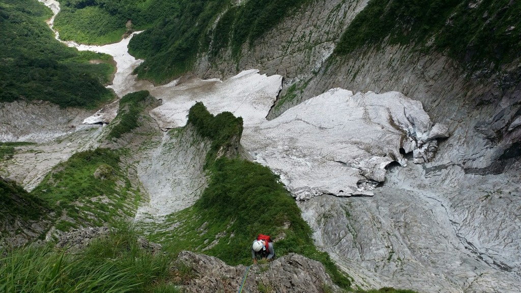 ★感想(山宮):谷川岳ベースプラザを出発と同時に雨が降ってきて一気に気分が落ちましたが、とぼとぼと歩き一ノ倉沢出合に着くと日頃の行いが良いせいかタイミングよく雨があがってくれました。アプローチ中の草は濡れてましたが岩は乾いていて快適なクライミングを楽しめました。先輩たちから本チャンは精神的に厳しい!!と言われてましたが難易度は高くないので落ちるイメージは無かったし厳しくはなかったです。(高度感はあるし一歩間違えて落ちれば・・・ですが、精神的におかしくなっているのか全然平気でした。)