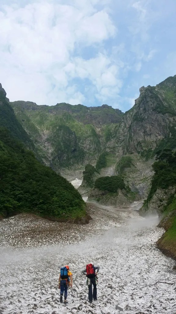 ・一ノ倉沢出合まで雪渓がなく右岸を巻いて雪渓に下りた。帰りも右岸の草付から這い上がり高巻いた。(後日中央稜へ行ったときに気付いたが本来は右岸高巻き道から沢へ下り左岸から雪渓に乗ればスムーズだった。)
