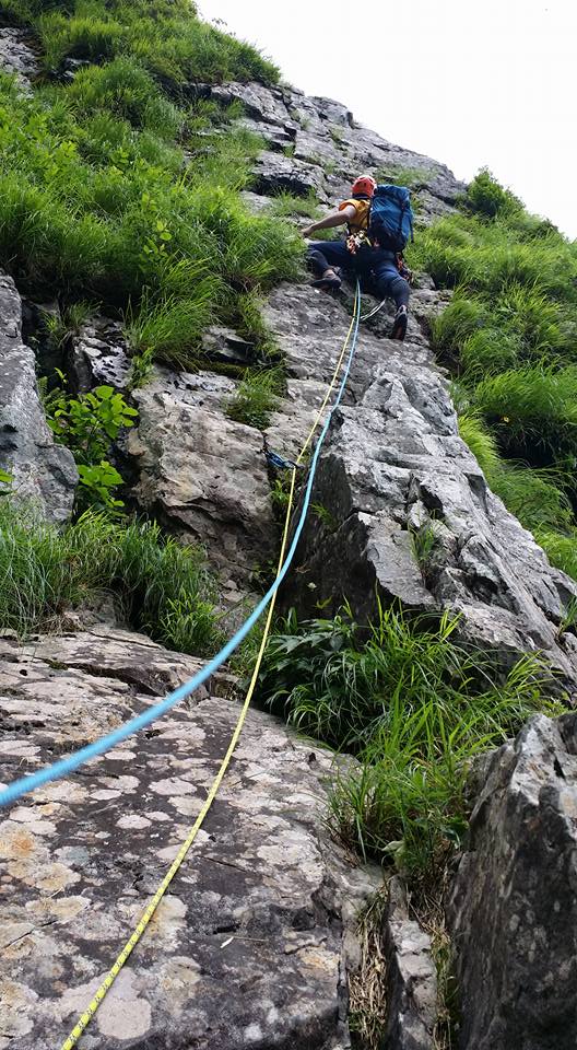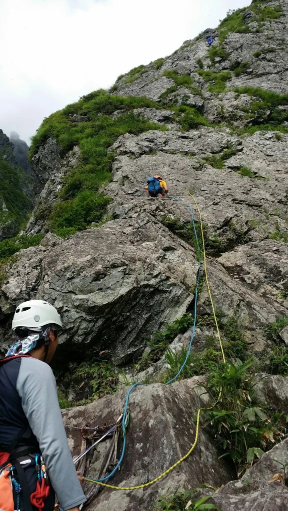 ★感想(山宮):谷川岳ベースプラザを出発と同時に雨が降ってきて一気に気分が落ちましたが、とぼとぼと歩き一ノ倉沢出合に着くと日頃の行いが良いせいかタイミングよく雨があがってくれました。アプローチ中の草は濡れてましたが岩は乾いていて快適なクライミングを楽しめました。先輩たちから本チャンは精神的に厳しい!!と言われてましたが難易度は高くないので落ちるイメージは無かったし厳しくはなかったです。(高度感はあるし一歩間違えて落ちれば・・・ですが、精神的におかしくなっているのか全然平気でした。)