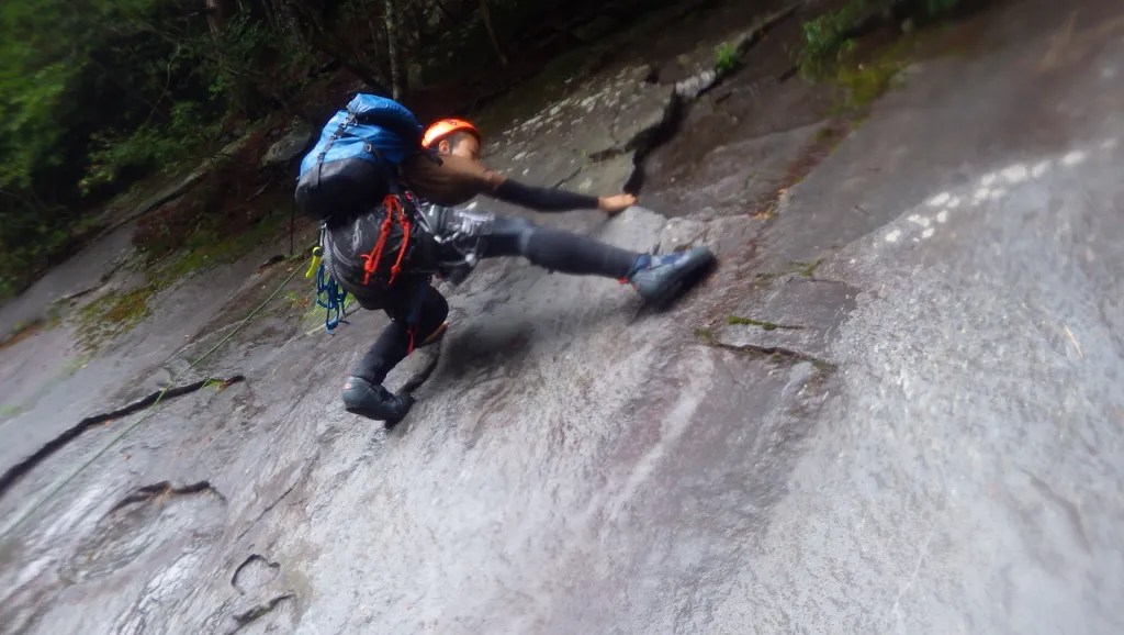 ・魚止の滝は左の岩斜面を登って巻きました。(登りはフリーで登り、下りはロープを使って懸垂下降しました。)