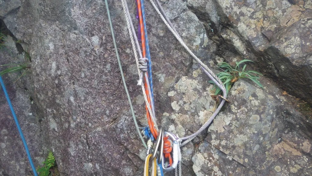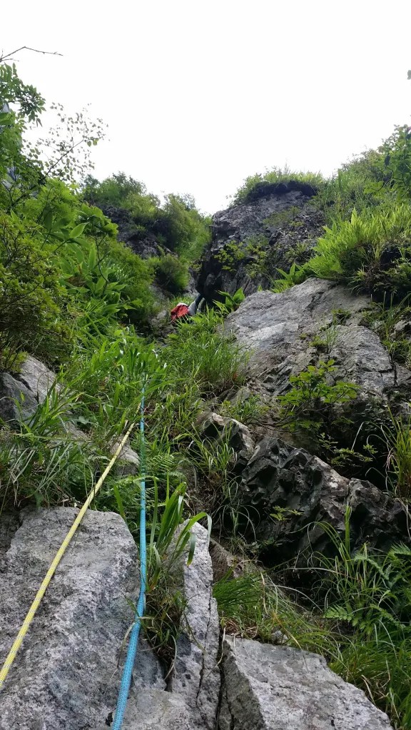 ・ロープの流れを考えると1回の懸垂で距離を稼ぐより屈曲しないようピッチを切ったほうがよい。(4ピッチ目の間違って登ったルートは右に左に屈曲してたがピッチを切らなかった結果、登り返しする羽目になってしまった。)