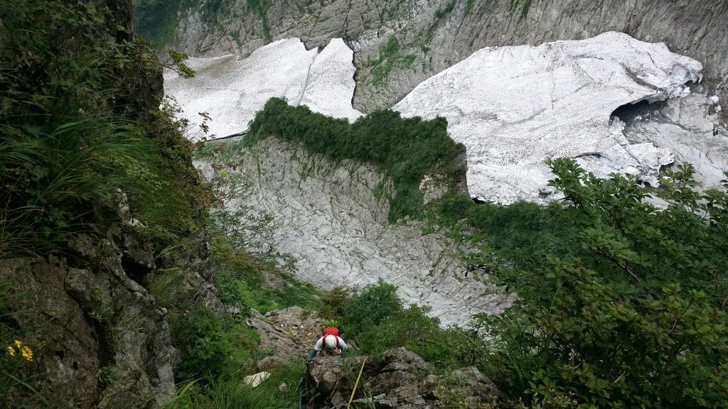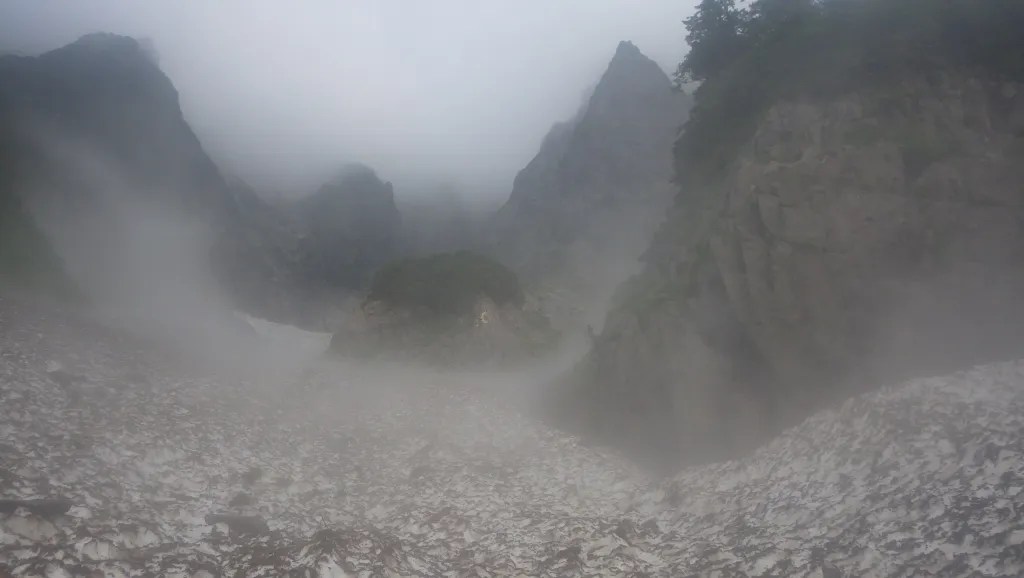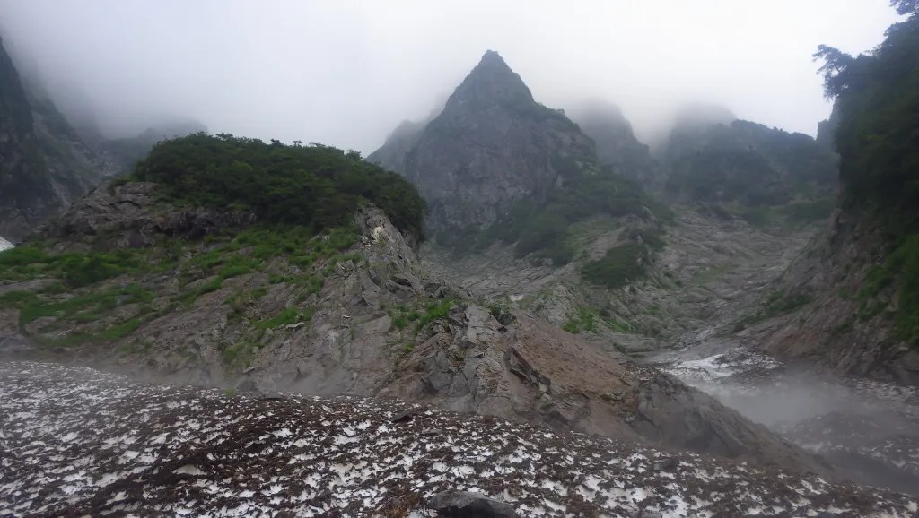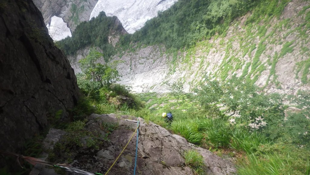 ・テールリッジ基部から雪渓へ下りるところですが雨で岩が濡れててとてもクライムダウンできないほど滑って危険だったのでロープを出して懸垂下降で下りました。