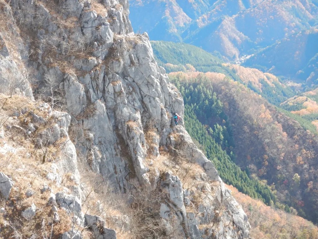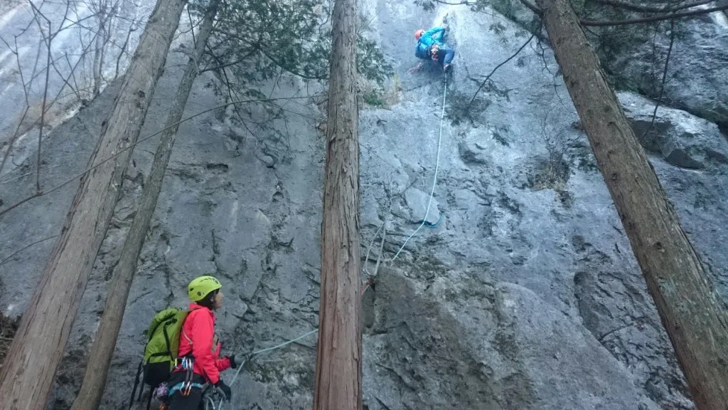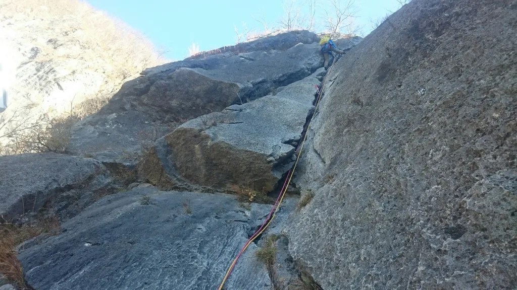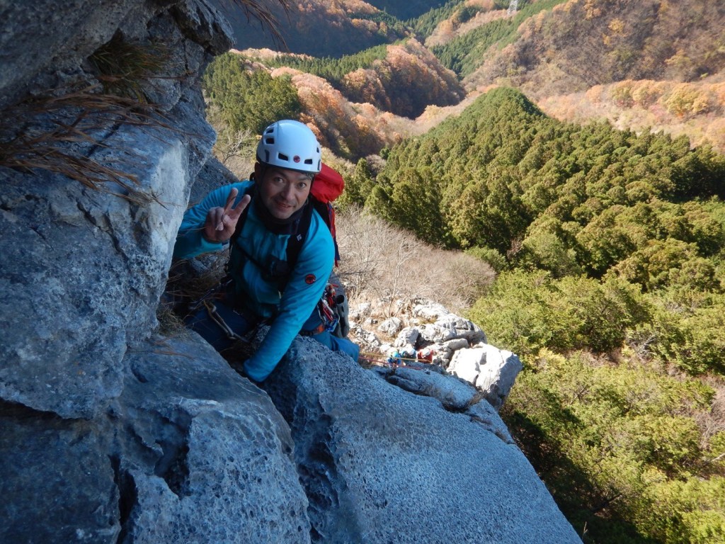 ★感想(山宮):天気は晴れで岩も乾いていて快適かと思いきや日陰は寒く風が吹くと極寒・・・。岩は冷たくずっと握っていると手の感覚が無くなってくる。また、立ち止まっていると足裏から岩の冷気が伝わってきて足の指がジンジンするほど寒かったです。3パーティーとも時間がかかることなく登攀できてよかったです。