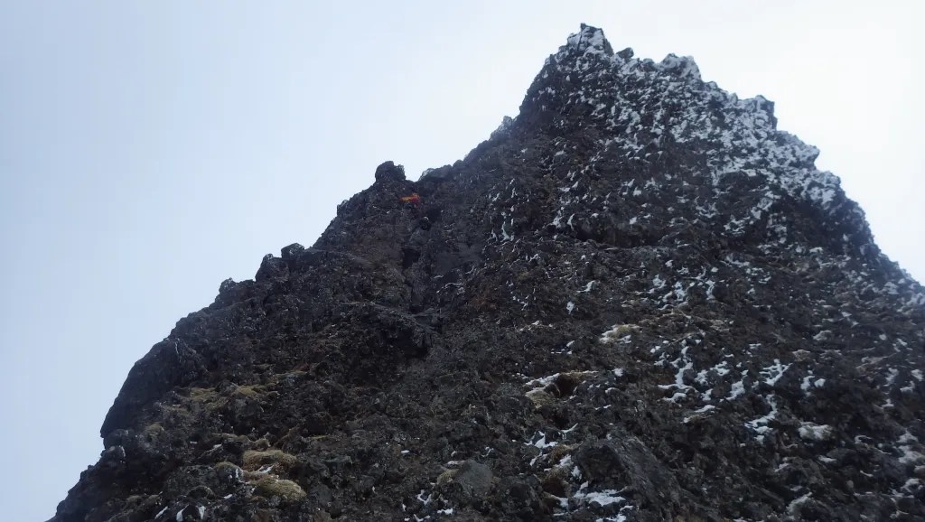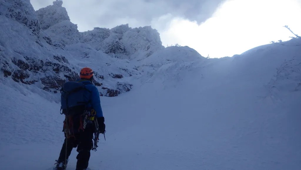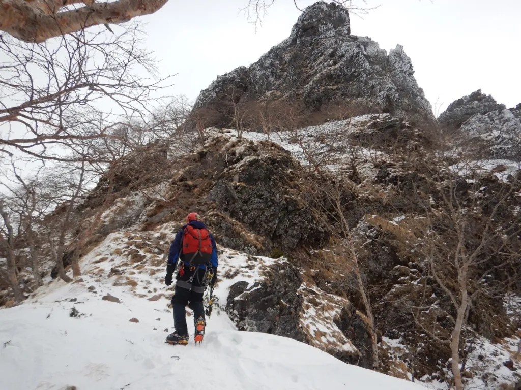 ■三叉峰ルンゼ→石尊稜・・・ここも初見ルートでしたが、アイスからミックスの継続登攀は達成感がありました。初見ルートあるあるですが、三叉峰ルンゼへの入口を間違い先に進んでしまいました。(鉾岳ルンゼ方面へと歩き石尊稜を少し登ったところで間違いを修正し、一旦下って三叉峰ルンゼ入口まで戻りました。)石尊稜の上部岩壁(Ⅲ)は高度感があり楽しめました。 ただ中間支点は途中のピナクルで1個しかとれずランアウト気味だったので落ちられない緊張感がありました。