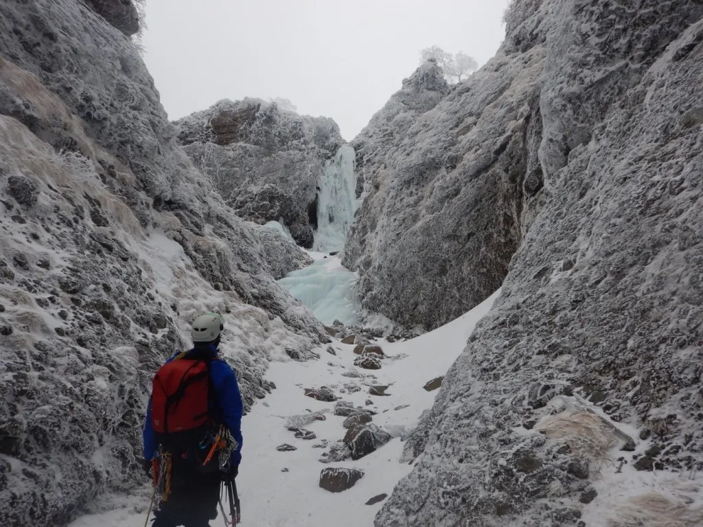 ■ジョウゴ沢では皆それぞれアイスクライミングを楽しみました。途中の小滝はフリーでサクサク登りました。F2とナイアガラの滝でロープを出しての登攀となりました。リードはスクリューを決めるのが難しかったです。( トップロープはリードと違ってサクサク登れました。)ジョウゴ沢は初見でしたが開けた沢でいろいろルートがあり楽しめそうな沢でした!