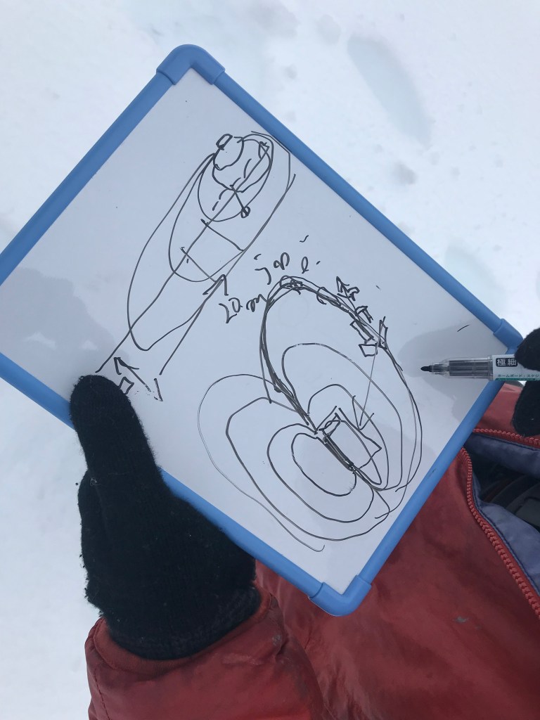★感想(山宮):丸山さんからアバランチビーコンについて講習を受けました。ビーコンの取り扱いについて、登山開始時のビーコンチェックの仕方、雪崩発生後の初動について、ビーコンでの捜索方法、ゾンデの使い方、埋没者の掘り出しについて、複数埋没者の捜索についてを一通りの教えてもらいましたが今回は初級者講習で、まだ4段階のうちの1段階程度だそうです。。機会を作って今後も講習を受けたいと思います。ビーコン講習の後は雪洞泊訓練予定(雪洞を作って1泊する。)でしたが雪が少なく雪洞泊作成は取りやめ、替わりに雪が少ないときの非常用シェルターとして使われるスノーマウント(かまくら)の作り方を実際に作りながら教わり講習は終わりました。知らないことを教えてもらい有意義な1日でした。