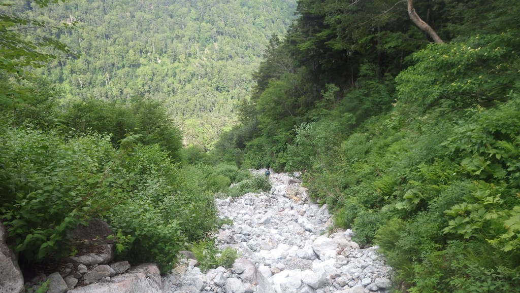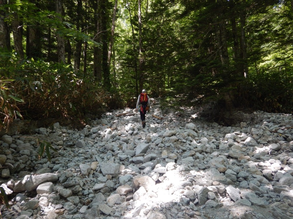 ・岩小屋跡の案内板から一般登山道を外れ沢の方へ行くとすぐに横尾谷渡渉地点があります。( 増水時の渡渉には注意が必要だと思います。)