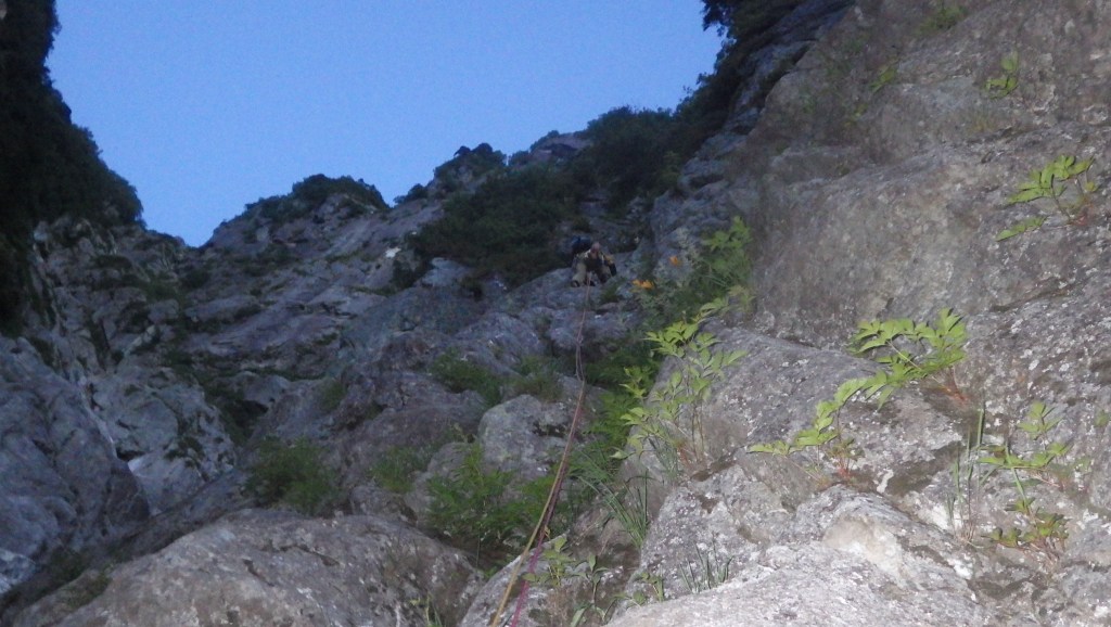・トラバース後は『簡単なルンゼを登り、最後は垂壁を登ってテラスへ』と頭の中にありルンゼ左上に終了点が見えたので(見えていたのは懸垂下降点でした。。)、そこを登ろう触ってみましたが難しい(あとでトポをよく見るとフリーのルートでした。。)残置支点もないのでフォールできないし、とりあえず右に見えたテラスに終了点があったのでそこでピッチを切りました。ハンギングビレイ体勢で上を見ると終了点が見えました(トポにある終了点)があとの祭り・・・