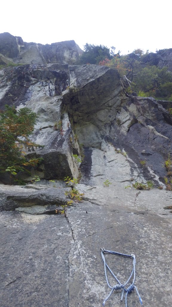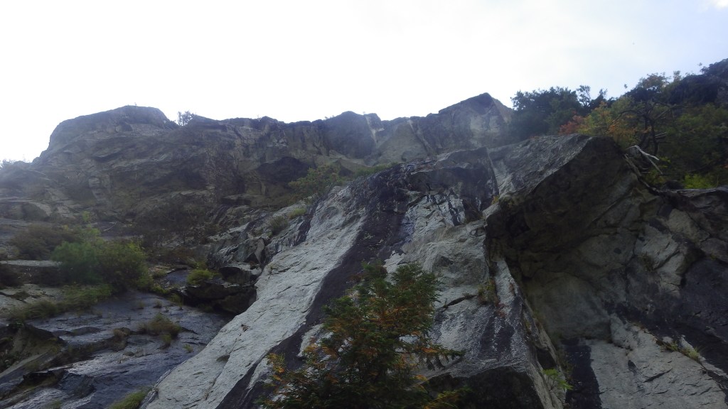 ・出だしから真っ直ぐなスラブを上に登って行くと上には残置支点が見当らなくなります。右に見える残地支点に導かれ右へトラバースすると簡単な小ハング~フェイスに残置支点があるのでそこを登ると緩傾斜帯に出ます。あとは滑らないように中央バンド終了点まで登って行き終了。