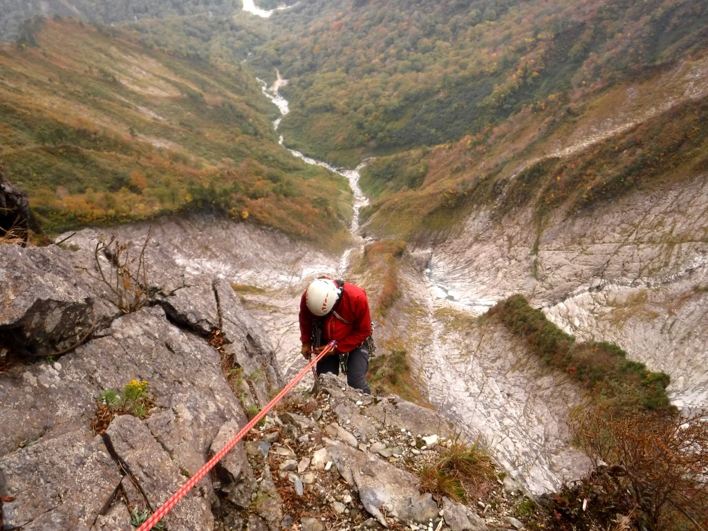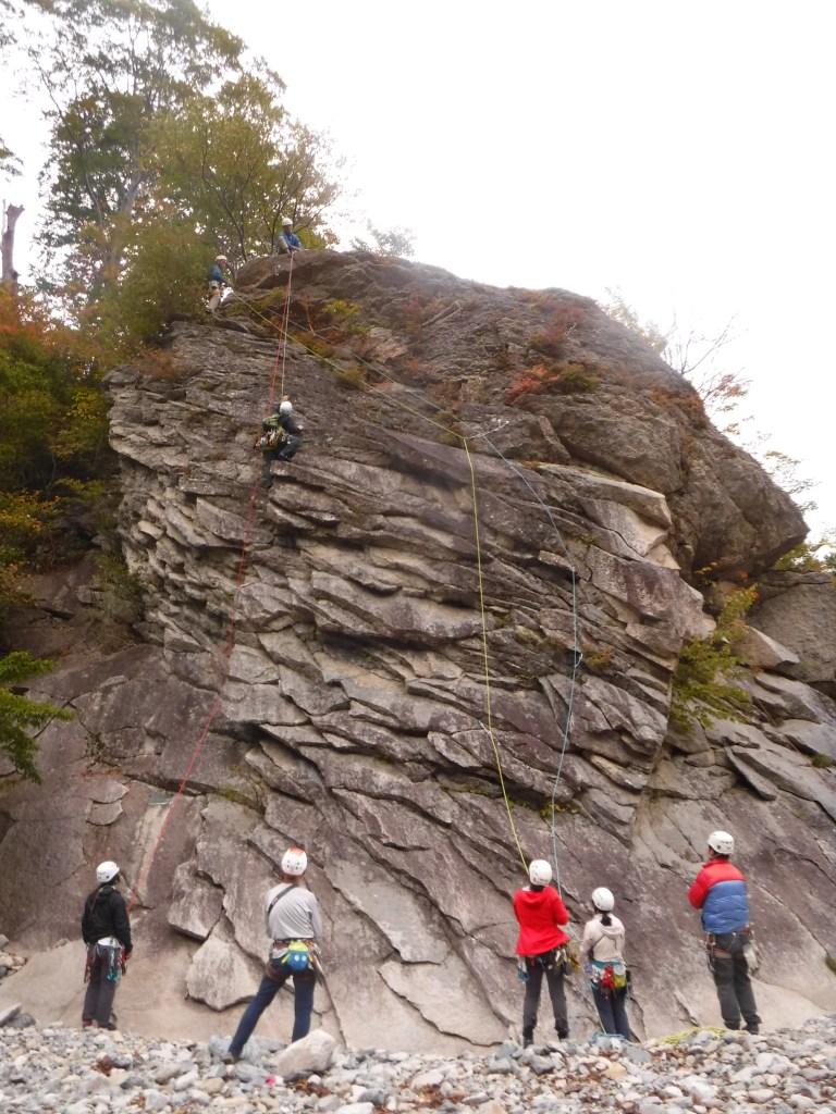 ★講習日程:10/13、マチガ沢マムシ岩で翌日登攀のパーティーに分かれてロープワーク等の講習。10/14、3パーティー6人が一ノ倉沢衝立岩中央稜の登攀(6P目登攀で終了し同ルート下降)、3パーティー9人が一ノ倉沢烏帽子沢奥壁南稜の登攀(アプローチに時間がかかりすぎたため南稜登攀は止めて中央稜1Pだけ登り同ルート下降)。