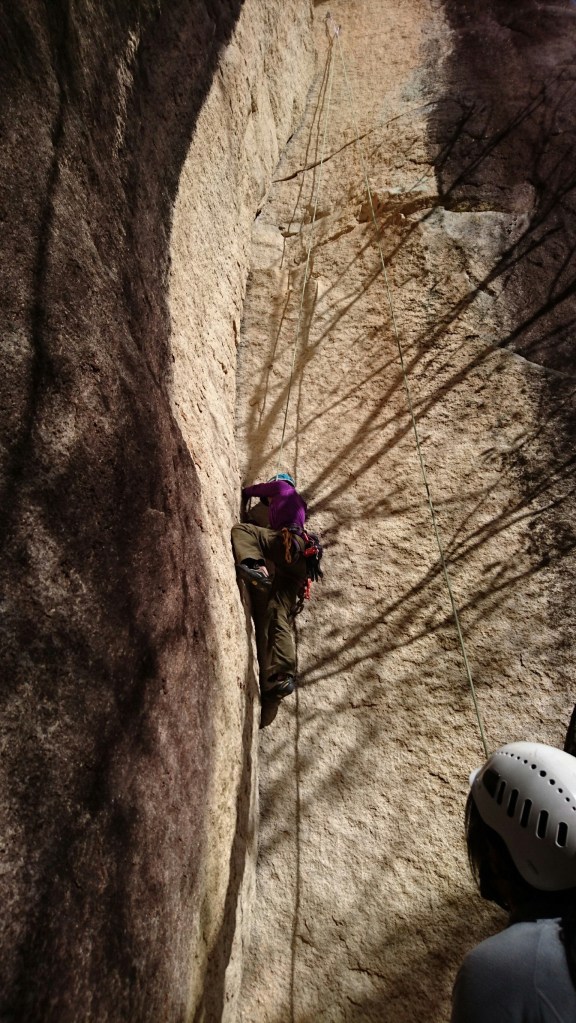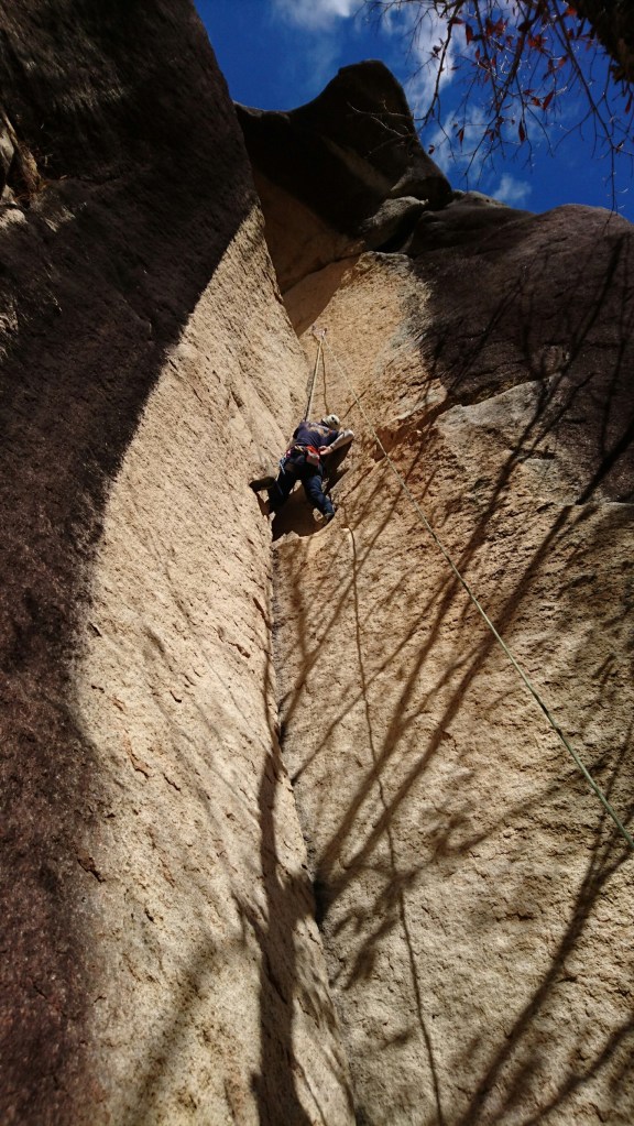 (荒井)クラックは難しい。父岩のルートは支点間隔が遠かった。