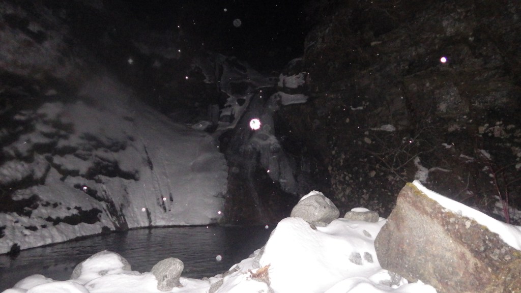 (山宮)初日の雨の黒戸尾根を五合目小屋跡まで約6時間かけて28kgある荷物を背負って登ったのが辛かったし体力の無さを実感した。この半年、重い荷物を歩荷して全然ロングを登ってないので当然ではあるがまた一から鍛えなおさないと!!2日目の黄蓮谷右俣はアイスと言うより雪山の様相だった。ロープを出して登った滝は坊主の滝と奥の滝の2箇所、それ以外はフリーで登れた。奥の滝から山頂までの雪山登りは長く感じた。夕方に崩れる予報よりだいぶ早く朝から終日の雪・・・この日はテン場まで戻ったら夕飯食ってすぐに寝た。3日目の篠沢七丈瀑は微妙なトポを参考に3Pで登ることにした。1P目をサクサク快適に登り支点に良さそうな氷を探すも微妙な感じ・・・右に灌木が見えたのでそっちへ逃げて支点構築した。岩出くんがフォローで登ってきて2P目登攀開始前に上部3P目の核心部分をあらためて偵察。凹角状はクラゲ状の氷でプアプロ必死、フォールしないで確実に登れる実力がアイス2年目の私にも岩出くんにも残念ながらない・・・。短い間隔で支点を取ってその度にテンション掛けて休みながら時間をかけて登れば登れそうだが今日は最終日、下山して新潟まで帰らなければいけない。あれこれ意見をぶつけ合って無理するのは止めようと敗退決定。そこから懸垂下降で基部まで下りて今度は岩出くんリードでもう1回1P目を登って終了としました。五合目小屋跡でテントを撤収し黒戸尾根を下山、尾白川渓谷駐車場に着いたときには暗くなってました。今シーズンはピッチグレードⅤ級のゲレンデアイスをバンバンリードで練習しよう、と思いました。