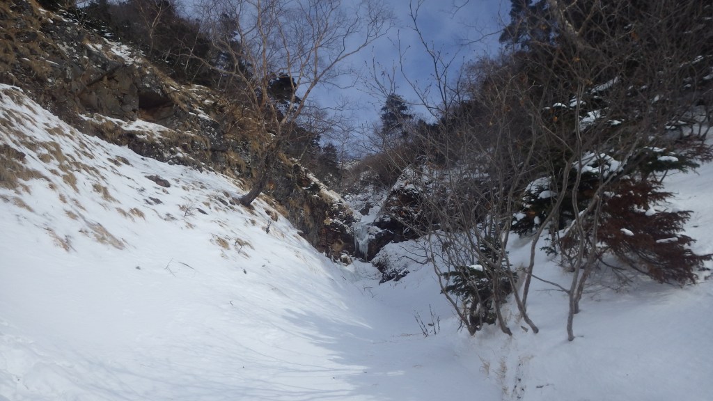 10m滝:下部まで氷が繋がってなかったので今回は登りませんでした。(この滝の手前からトレースを辿って中央稜へ移動。)