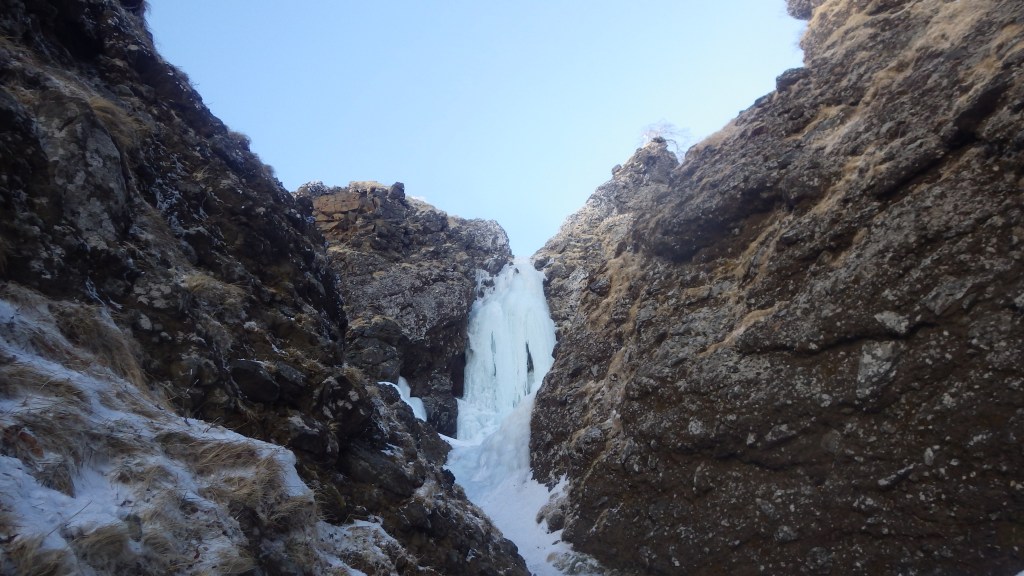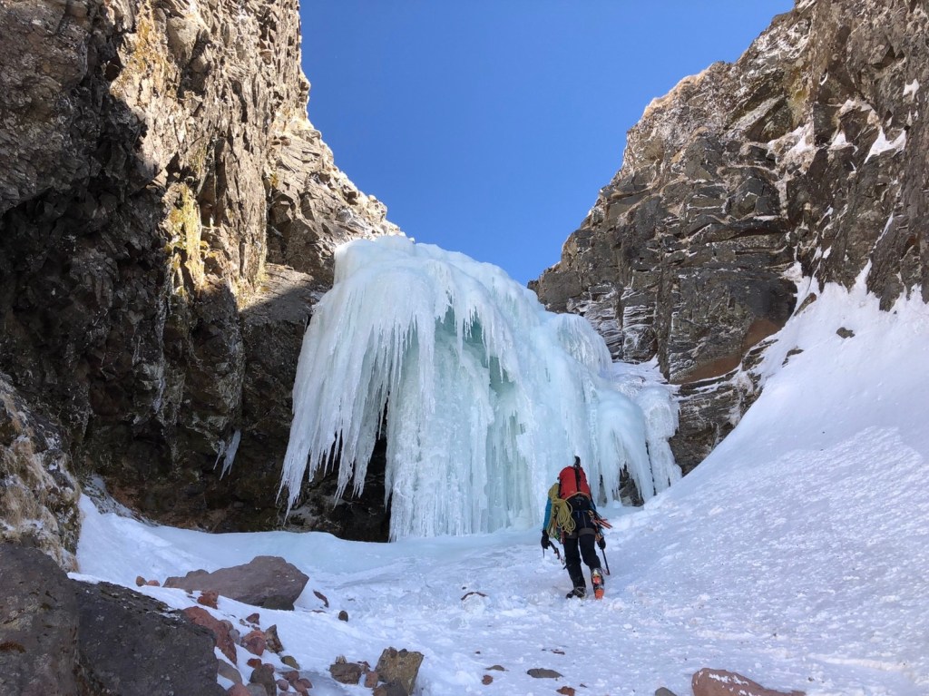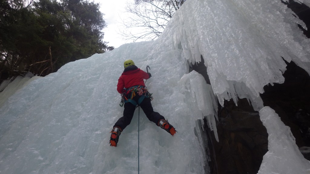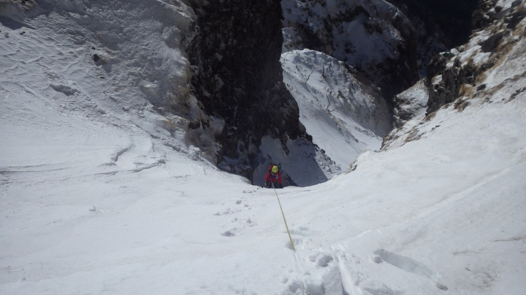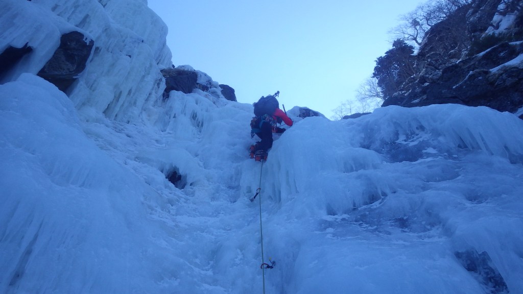 【ジョウゴ沢~硫黄岳】氷の氷結具合はF2は普通で大滝は水氷。乙女の滝はつららの処理をしないとしっかりしたプロテクションが取れない感じ、登るなら先行パーティーが取付いていた右横ラインかな。(Ⅵをリードできる実力があればどのラインでも問題ないんだろうが・・・。)
