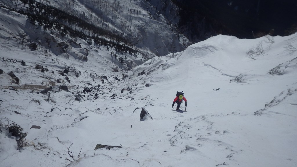 大滝上部~硫黄岳 雪壁を直登し岩壁直前で左へトラバースして左の尾根へ。そこからさらに雪壁を左上して一般登山道に合流し山頂へ。