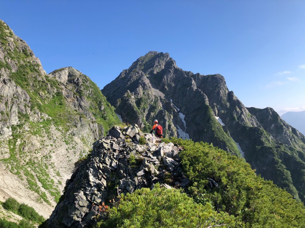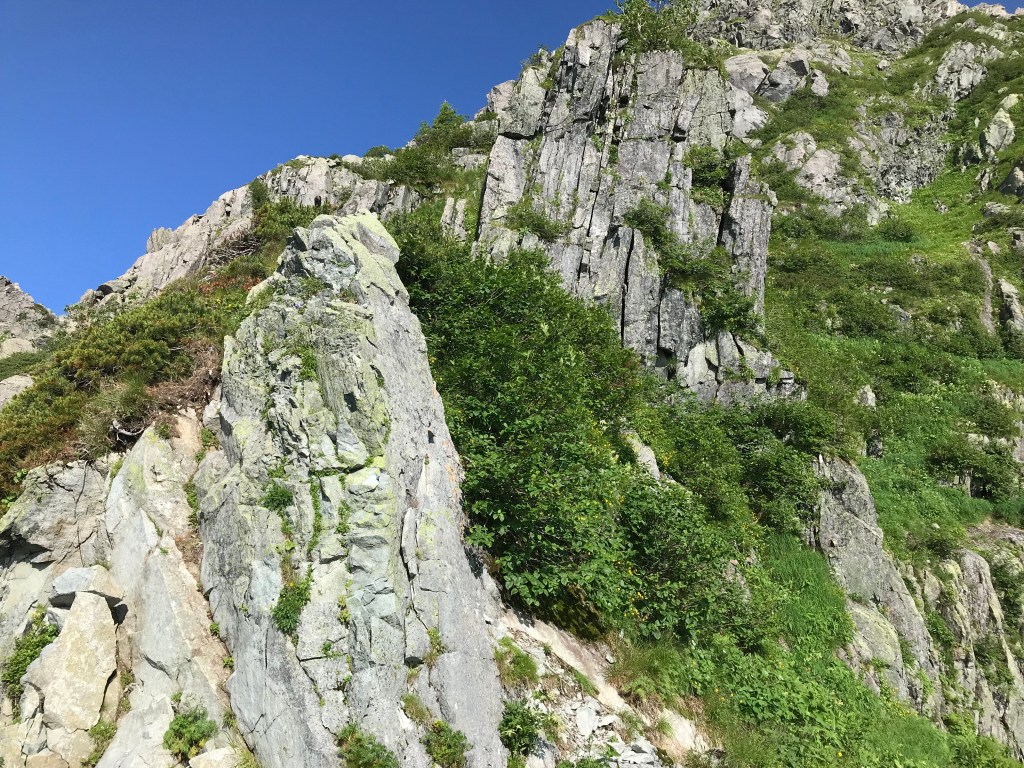 (山宮)初日はテント場でぐっすり昼寝をしたかったのですが、予想外に暑くて快適に寝れませんでした。2日目は移動距離も行動時間も長くなりました。東稜の長く急な登り、南西尾根の長く急な下り、そこに暑さも加わり疲れました。(フル装備を担いでなかったので少しはマシでしたが、いろいろ不要なものを携行したので荷物はそれなりに重かったです。)ひょうたん池への草付きの登りは草が朝露で濡れていて服がびしょびしょに濡れてテンション駄々下がりでした。(東稜歩いてたらすぐに乾きはしましたが・・)情報が少ない中(少々のネット情報と東稜冬季登攀のトポのみ)で今回初見のルートを歩きましたが特に大きな問題もなく歩けました。左足首はまだ万全ではなく体力もまだまだ元に戻らずといった感じですが1日で周回できて良かったです。