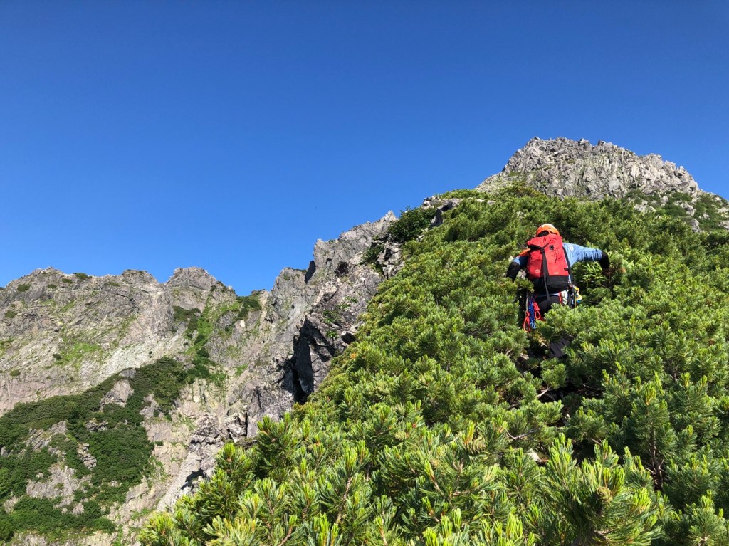 ・明神岳5峰から南西尾根の肩への下りで違う尾根へ下りそうになってしまいましたが間違いに気付きハイマツ帯を乗越して正解ルートに復帰しました。