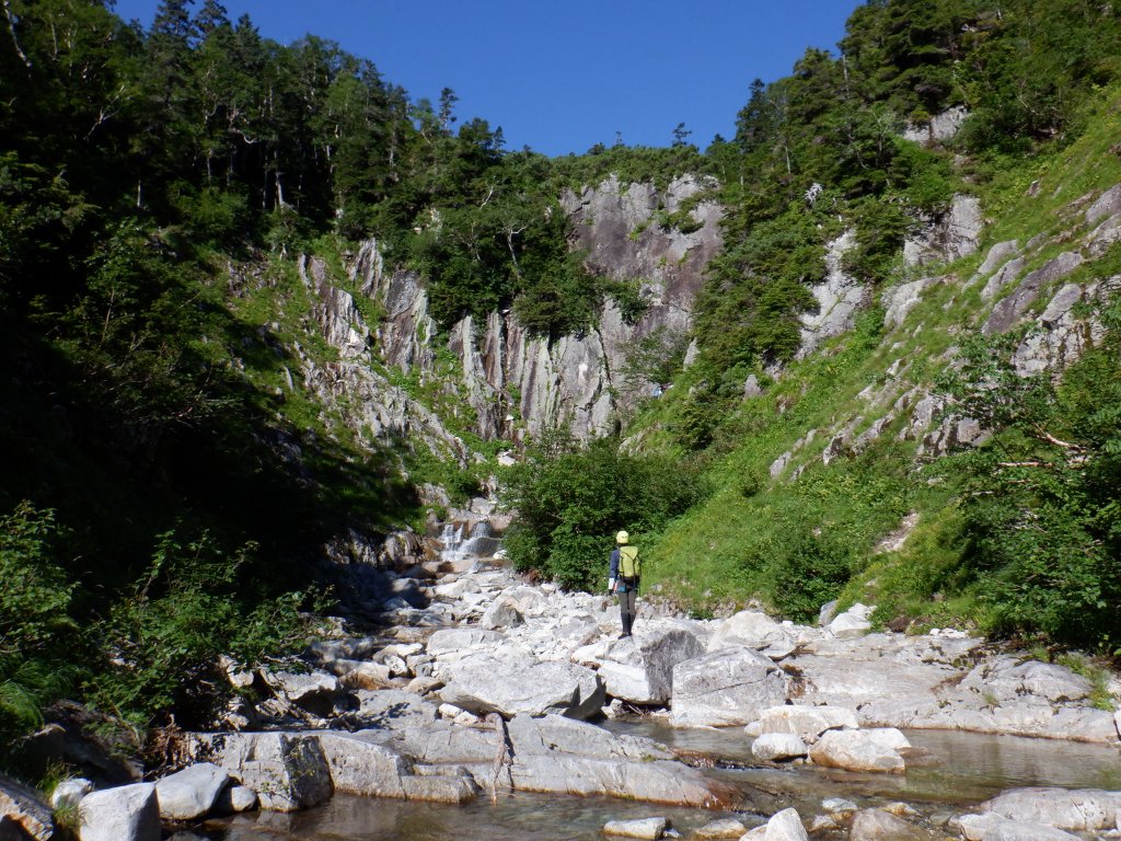 ・2段40m大滝を過ぎてから出てくる二俣は左へ行き、次に出てくる奥の二俣も左へ行くと中俣乗越へ出ます。(最初の二俣を右に行くと赤木岳へ、次の奥の二俣を右に行くと赤木岳と中俣乗越の中間地点へ出ます。)