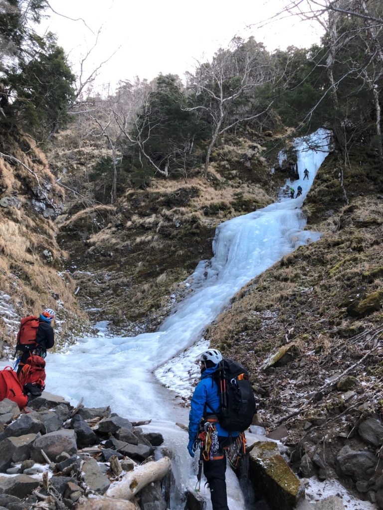(進藤み)雪が無くアプローチはゴーロ歩きで大変だった。シーズン初アイスでしたが快適に登れました。時間が押し迫る中、最後にもう1本登らせてもらいましたが、結果ヘッデン下山になってしまったのは反省です。 (進藤ま)アプローチが2時間と厳しかったですが(途中からのゴーロが特に辛かった)今シーズン初にしては気持ち良くアックスが決まり楽しくポストクリスマスルンゼでリードの練習も出来てとっても良かったです。 クリスマスルンゼの2ピッチ目は水が滴っていてヌンチャクやスクリューが凍っていて回収が大変でした