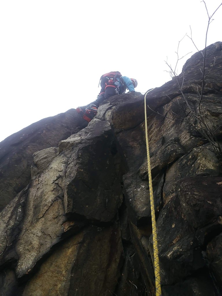 ・2P目(Oさんリード):フォローなので問題なく登れました。Oさんが正規ルートから少し左にそれて登ったので浮石が多かったです。垂壁を登り終えたガレ場でロープいっぱいになったので2P目終了点手前でピッチを切り、フォロー2人が3P目始点まで先に行き、その後Oさんが登ってきました。