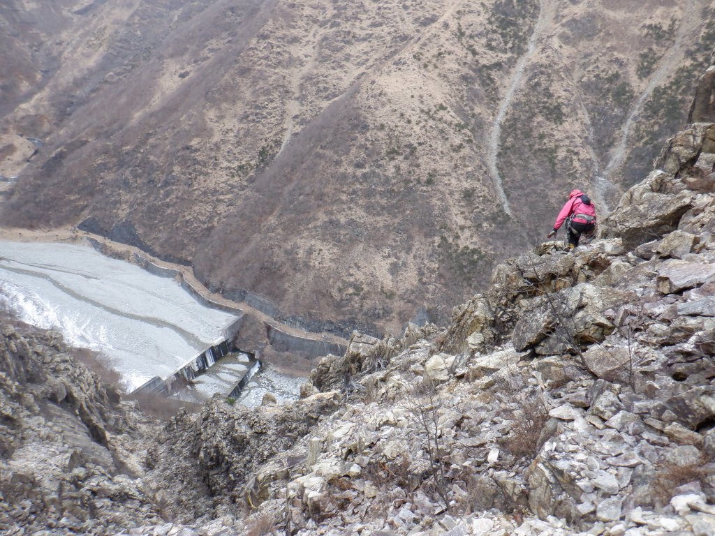 ・ジャンダルム右壁のルンゼを歩いて下りていき最後の方で懸垂下降して下山。