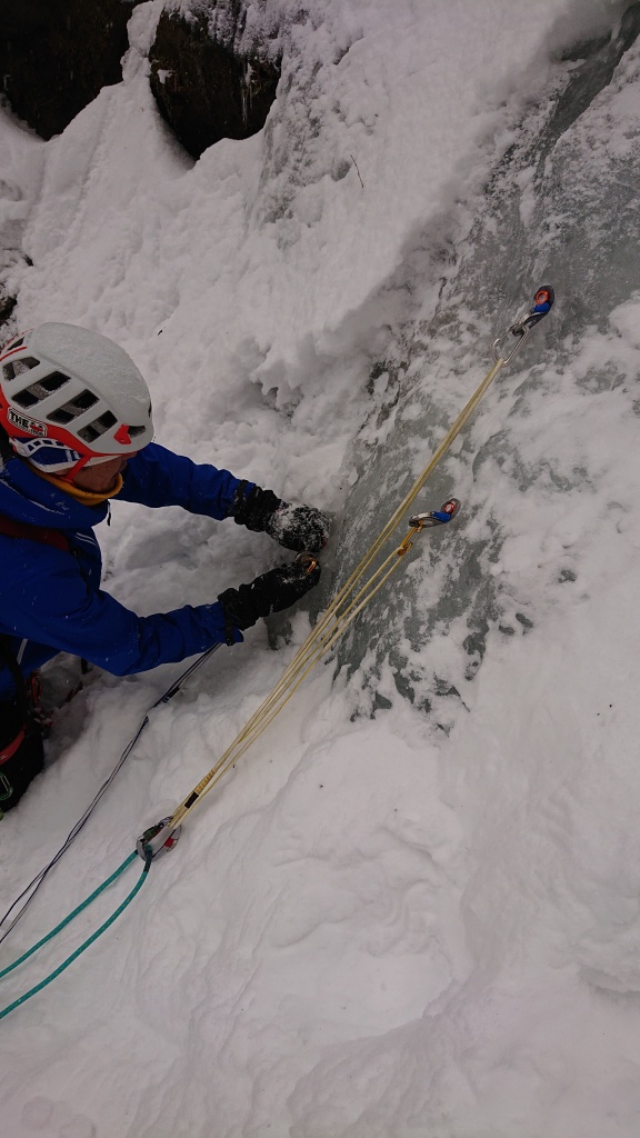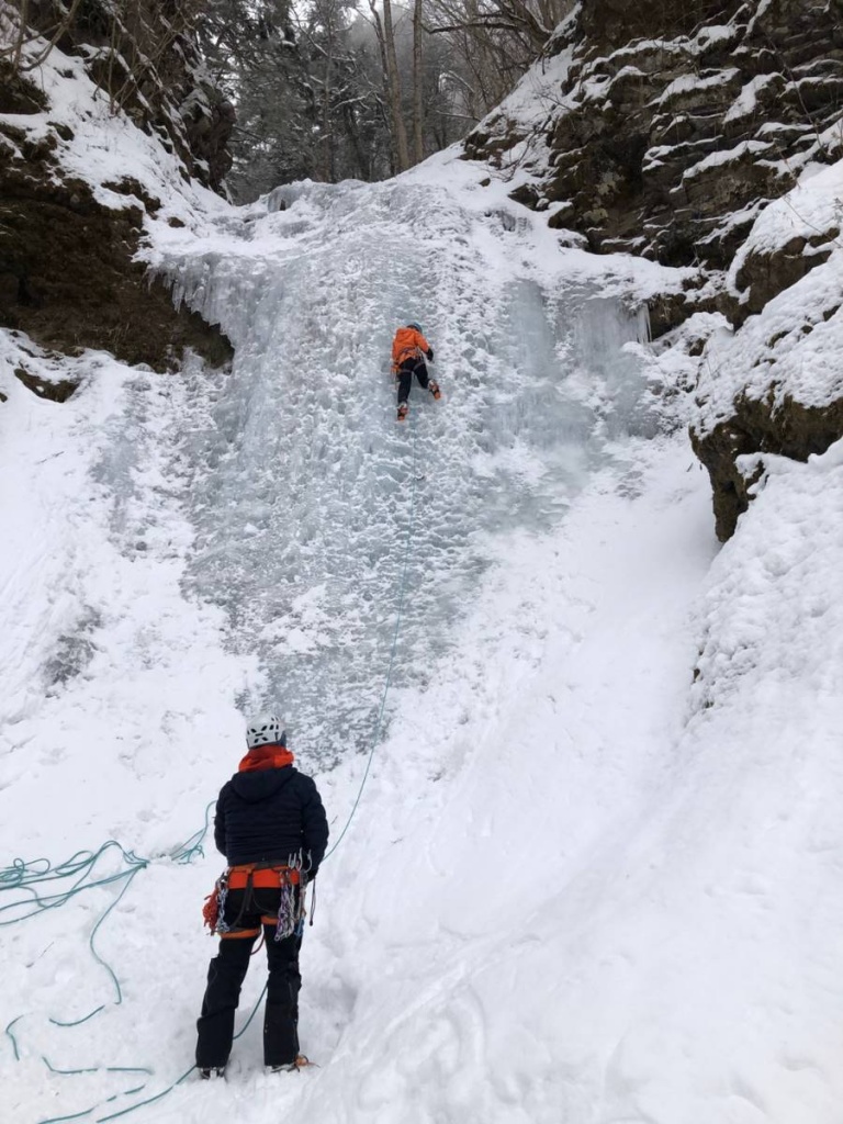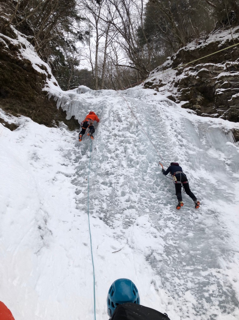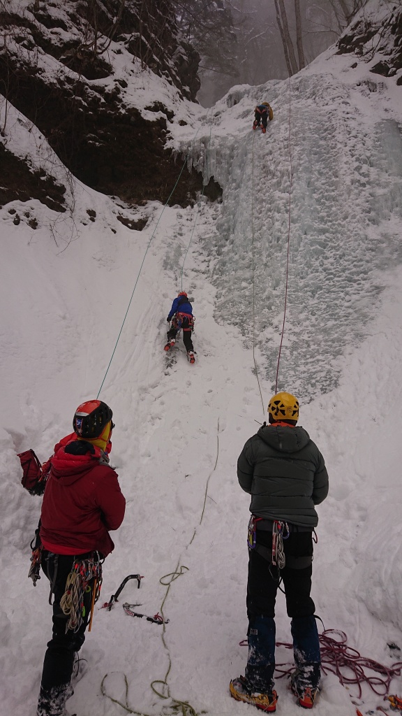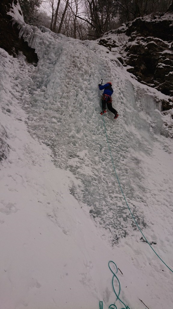 (山宮)雪が多くて思っていたよりアプローチが長くなり時間喰った。春日ルンゼのF1の氷の状態はまずまず。上の方は雪が・・(F3が一番良い感じの氷でしたが如何せん短い・・)帰りはアソシエイツルンゼから上に抜ける予定でしたが、上に抜けるのにラッセルがあると大変なのでF1でトップロープで練習することにしました。先行パーティーが帰ってF1貸し切りになったのでトップロープを終了して各自1本づつリード練習しました。皆、ノーテンでスムーズに登れてて良かったと思います。