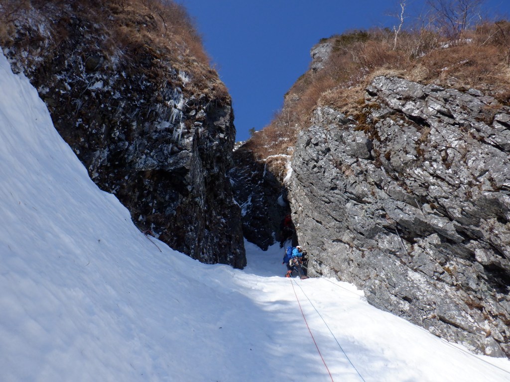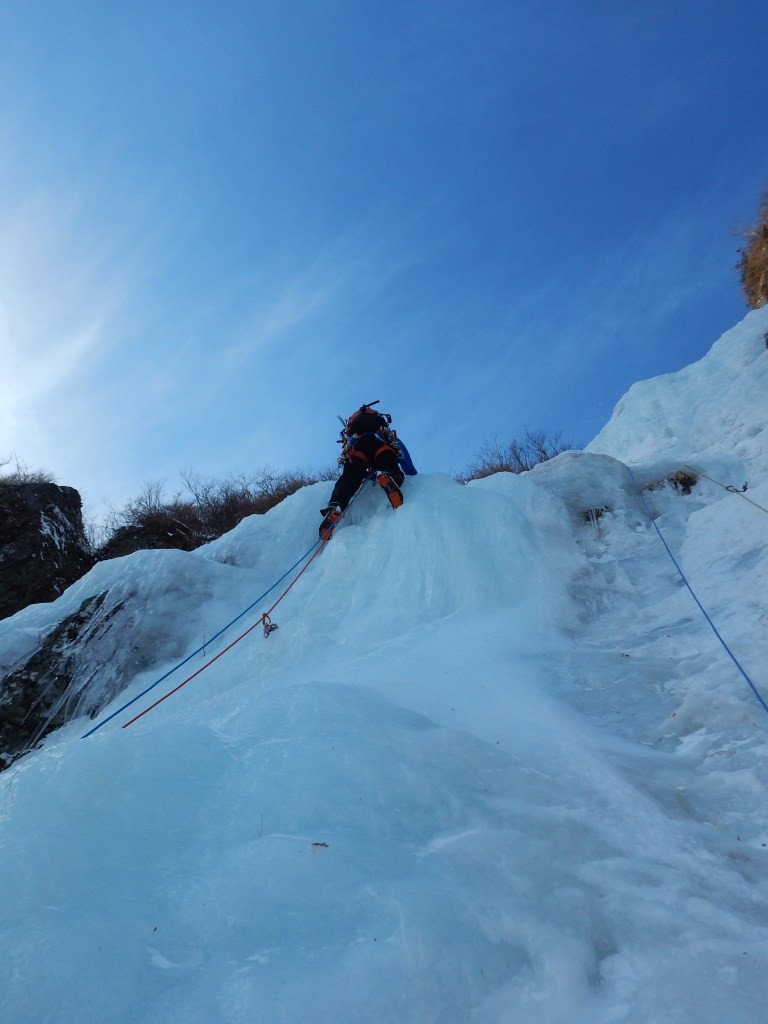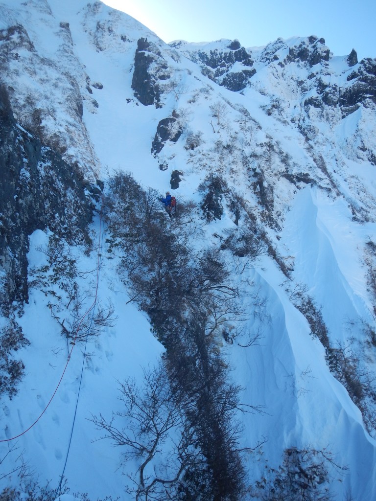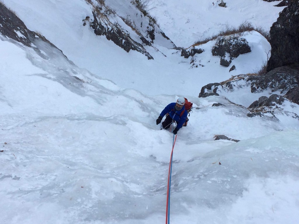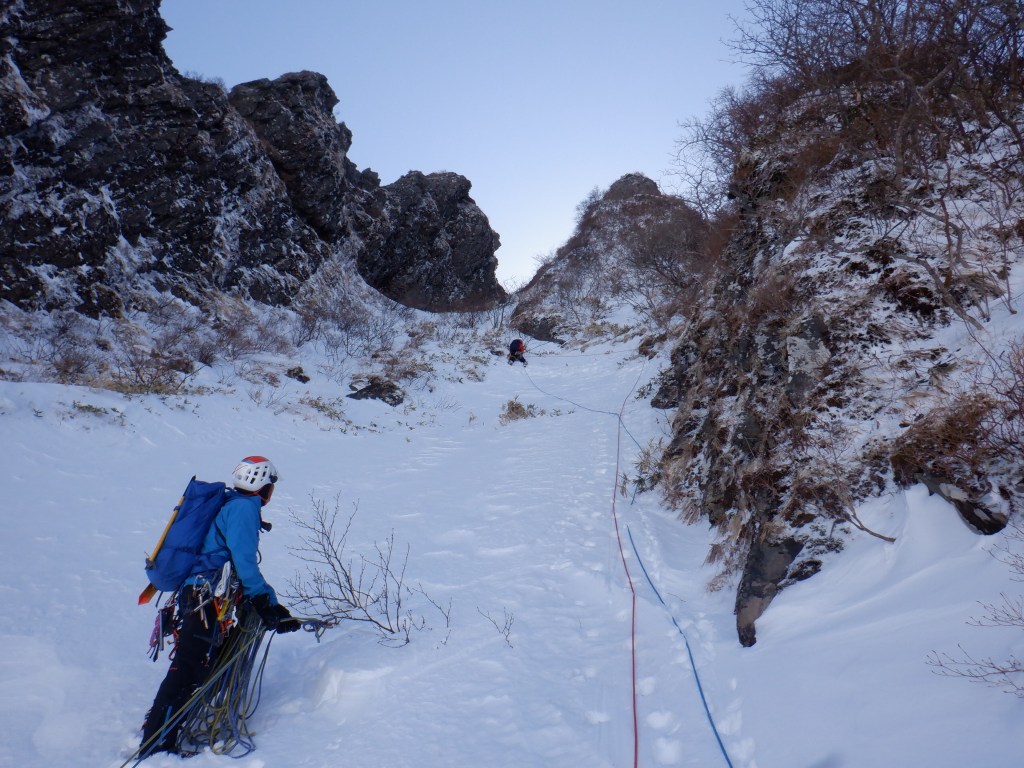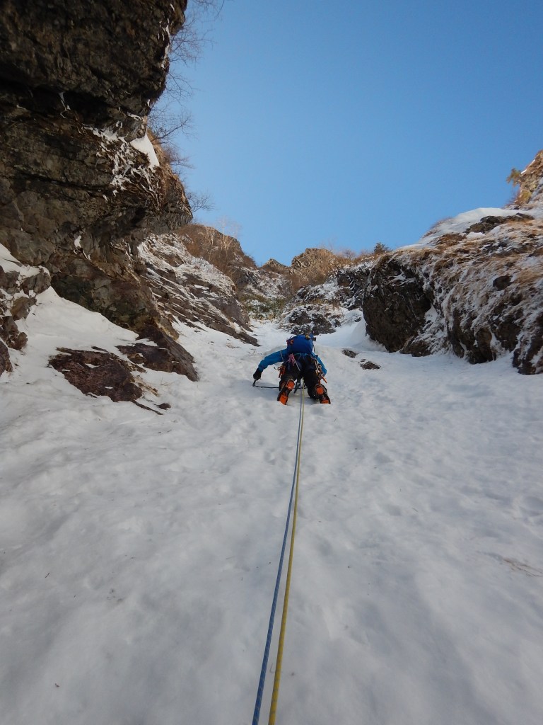 ・出だしの氷がスカスカで脆い。その後はだらだらと雪の緩斜面を氷部分まで登りスクリュー2本で終了点構築。