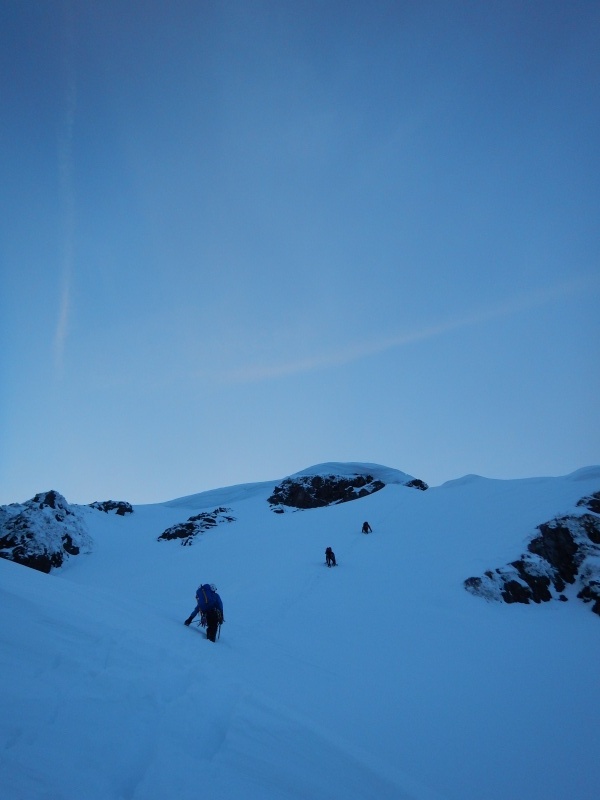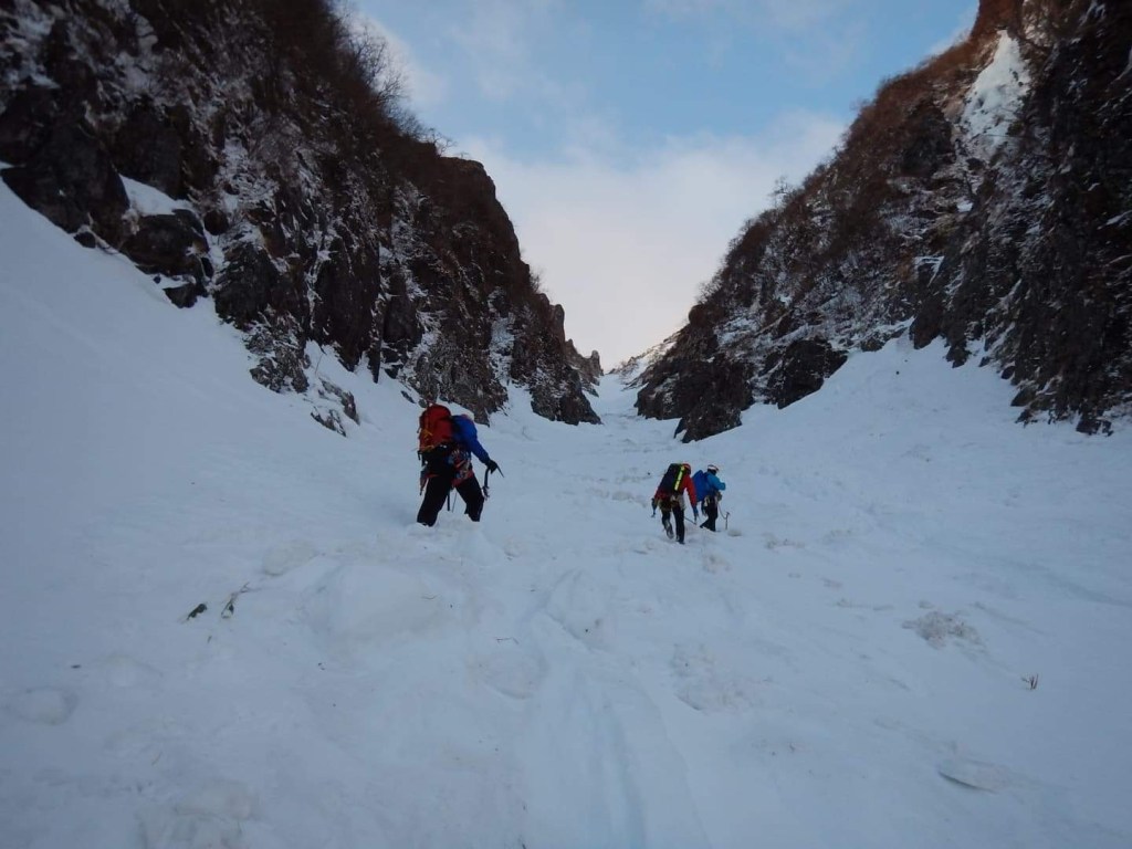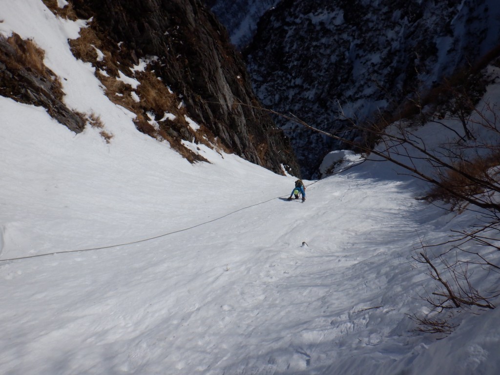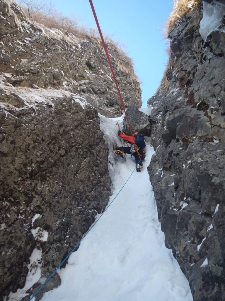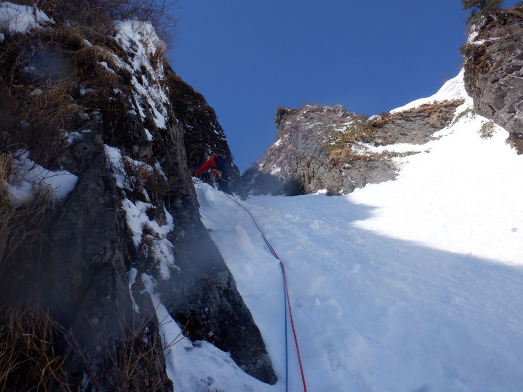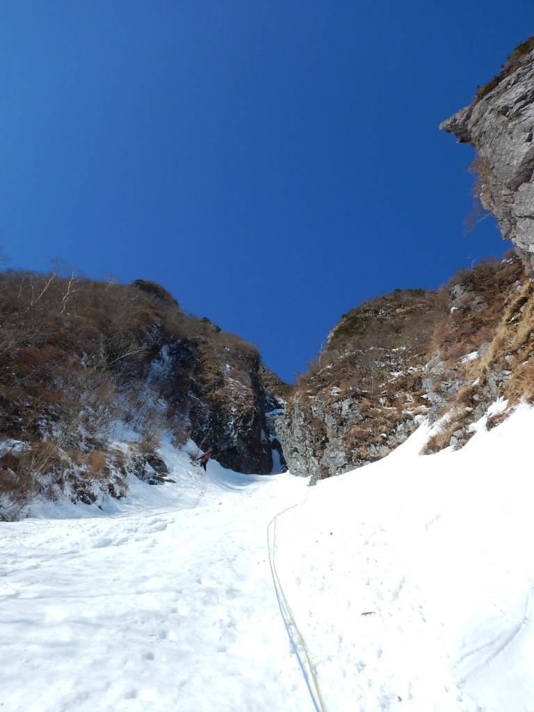 ・出だしの氷がスカスカで脆い。その後はだらだらと雪の緩斜面を氷部分まで登りスクリュー2本で終了点構築。