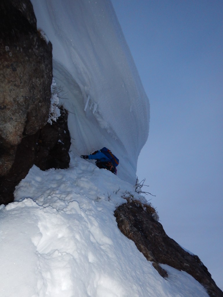 ・このピッチはほぼ雪壁で、雪の状態は踏み抜くところもあり気持ち悪い感じだった。(踏み抜いたところは雪と岩の間に空間があり・・・)