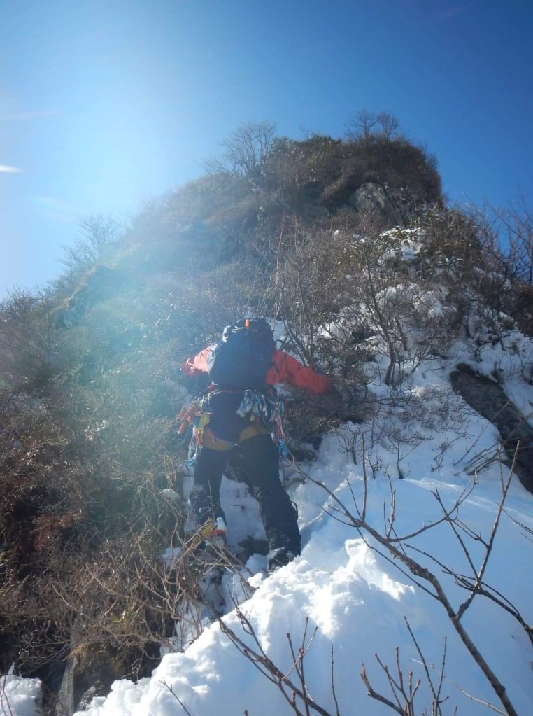 ・雪のルンゼをコルまで登りコルからは藪を登る。