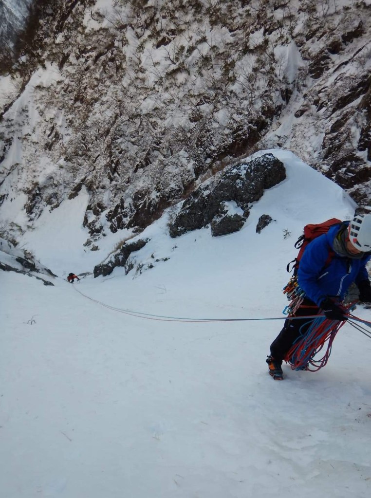 ・リードのOさんがF5基部まで雪田を登っていくがロープいっぱいになりそう。F5基部から少し下がった左側の灌木がしっかりしていたのでそこにランナーを取ったあとコンテで登りF5基部まで辿り着く。F5基部の薄氷で終了点を構築していたがプアプロで核心に突っ込むのは微妙な感じだったようでランナーを取った灌木を終了点にしようとコールがあった。