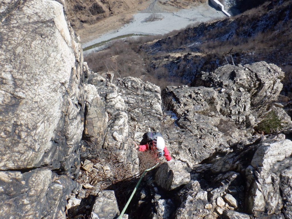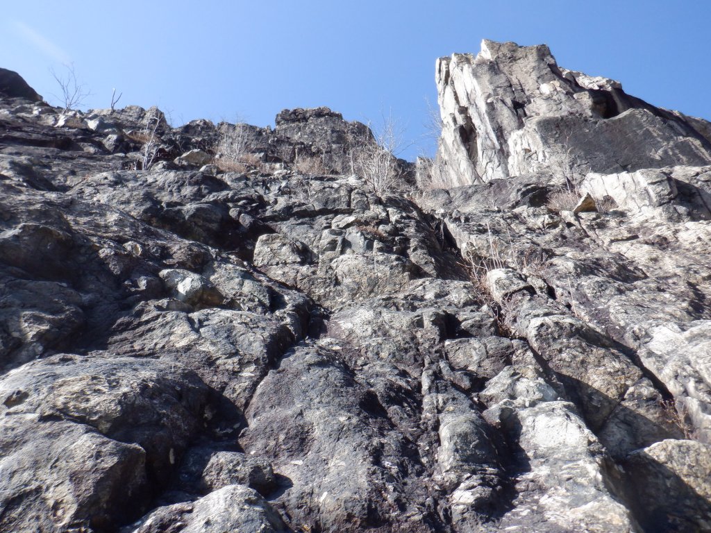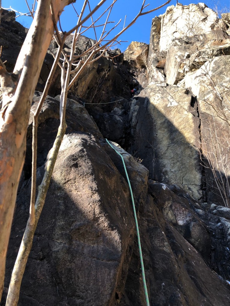 ・4P目(山宮リード):中央スラブの右側を登り右端の灌木でピッチを切りました。登攀自体は問題なし。