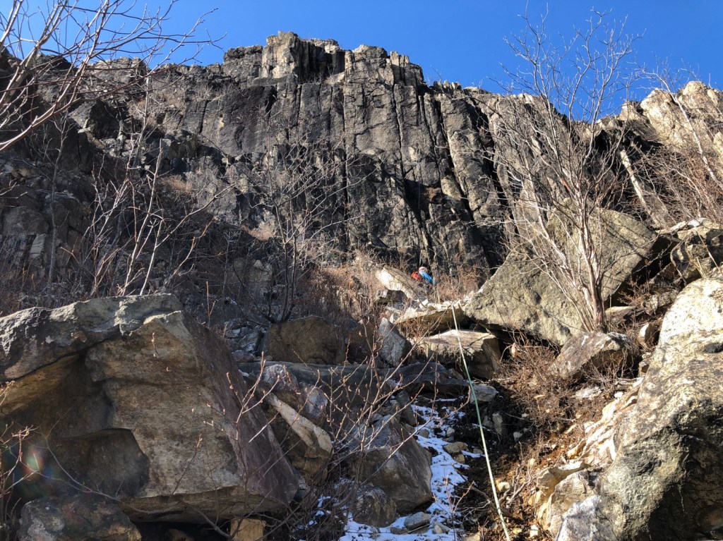 ・5P目(山宮リード):出だしの右端から2つ目のチムニーを登りすぎチムニーから左上のコブシ岩直下の棚に乗ったものの行き詰まりクライムダウン。その後、チムニーを少し下って一段下の左の棚に乗りバンドを左へ行き岩を回り込むと支点があった。50mロープで半分のコールがあったのでトップまで抜けれるかわからないのでここでピッチを切る。