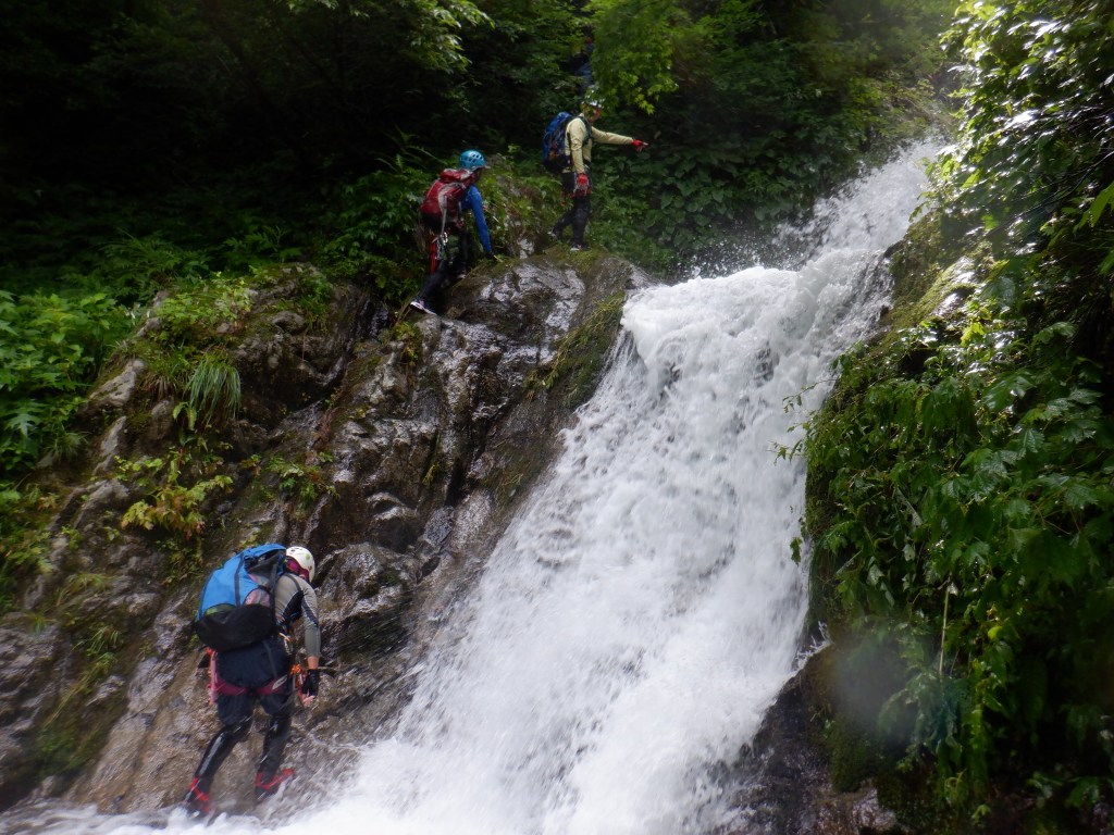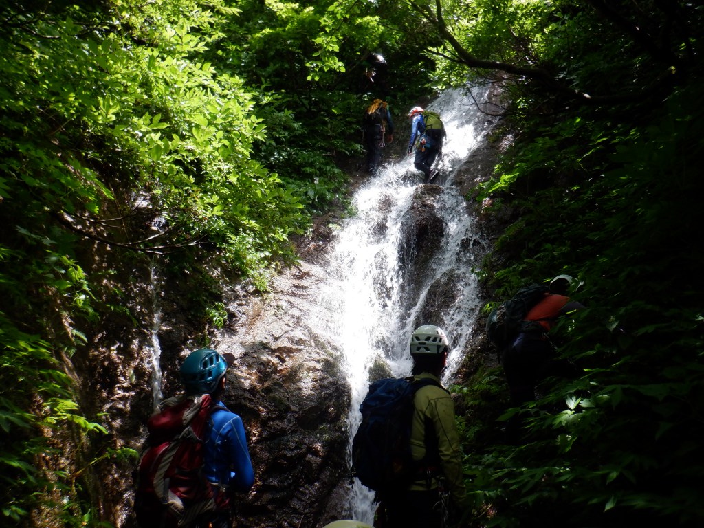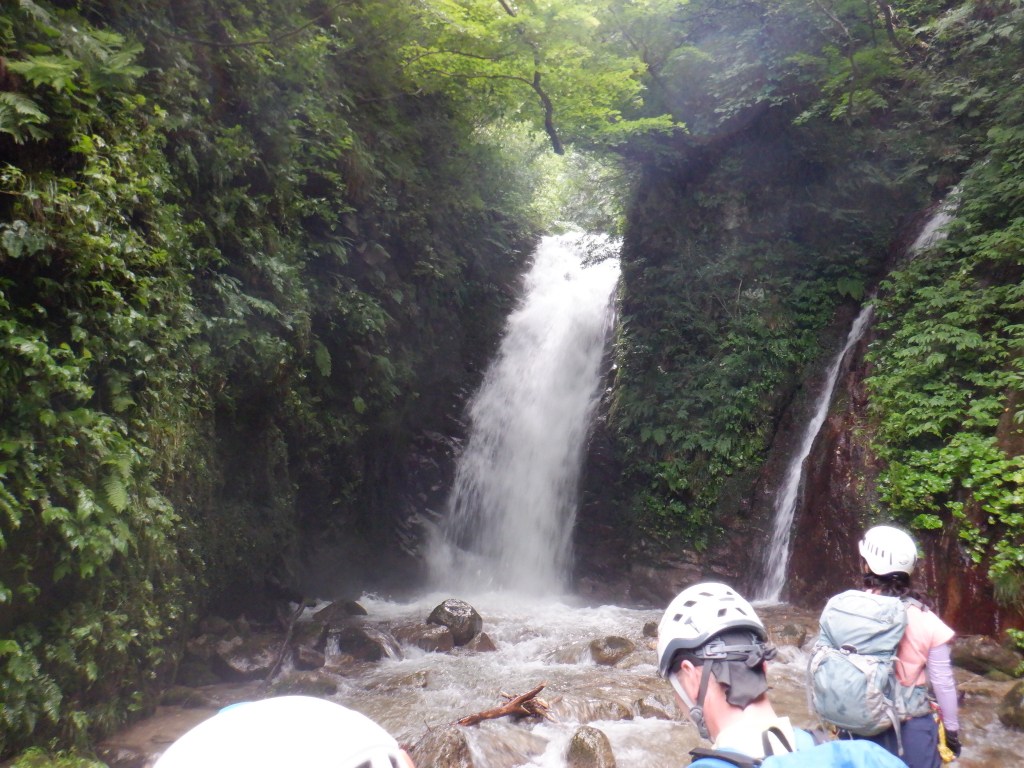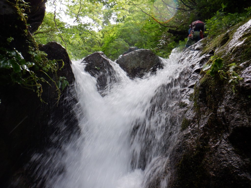 (進藤ま)今回は進藤みのリハビリを兼ね、この梅雨の雨ばかりの時期の中で降らなそう~って言う天気予報を信じ優しい沢と言われている五頭の小倉沢へ行ってきました。前日の朝に急遽行く事を決め、参加希望を所属する山岳会の皆さんに募ったらなんと6名の参加希望が!私達を含め8名でいざ出発です。当日五頭山の駐車場へ着くとポツポツと雨が…「もうこれ以上降らないで~」と祈りながら出発。思いのほか水量が多めだったようでやさしい沢ではなく迫力のある沢へと変貌していました!そんな中で登り方など色々と試せてすっごく楽しかったです。さらに今回は沢靴を「ハイパーV」を試してみました!赤っぽい苔は気持ち滑りましたがフェルトより滑らなかったと思います。ただハイカットではないので砂が靴の中に溜まりました。小倉沢は近くて楽しくて藪漕ぎも無く…これからはアブ等が怖いですが時期を見てまた行きたいと思いました。