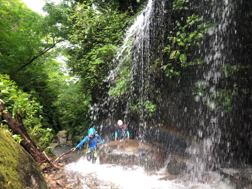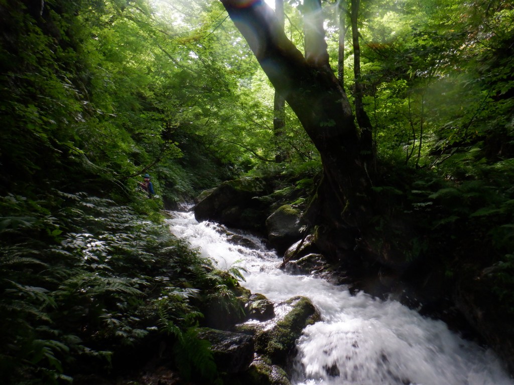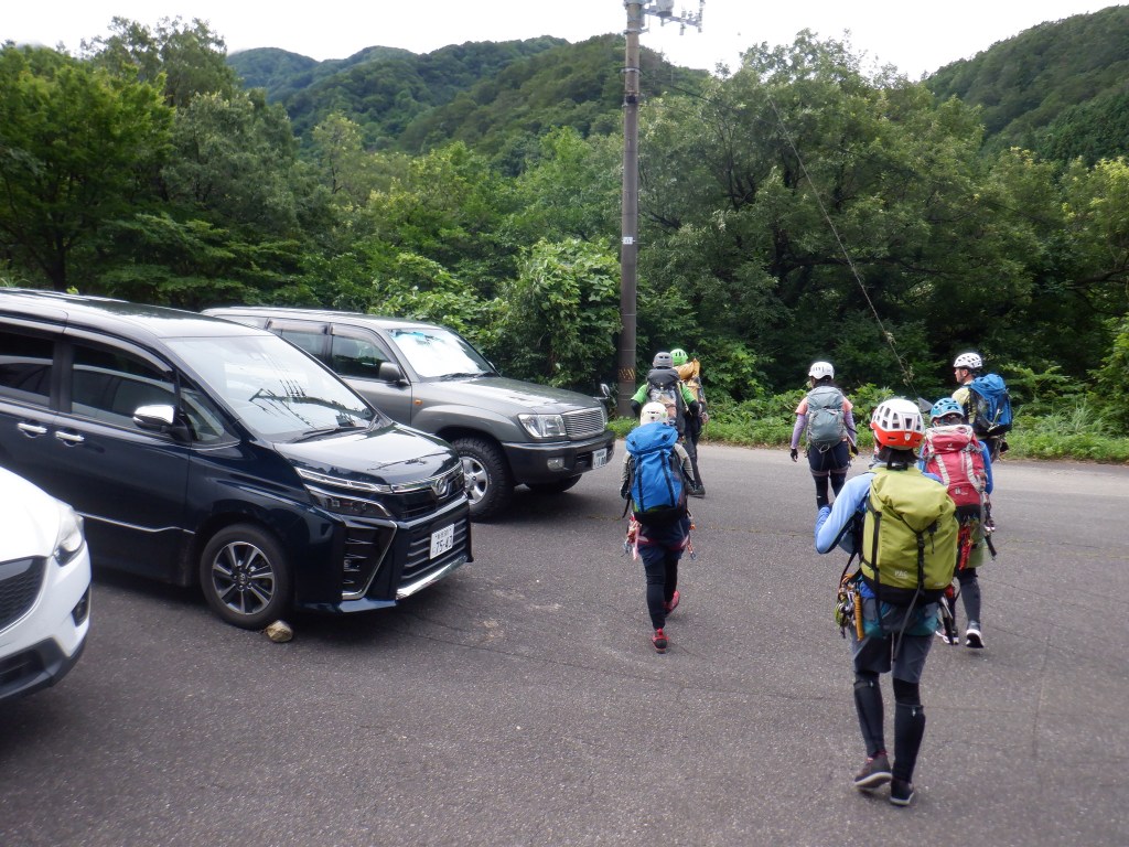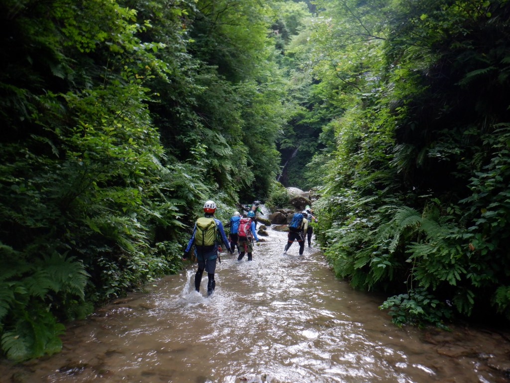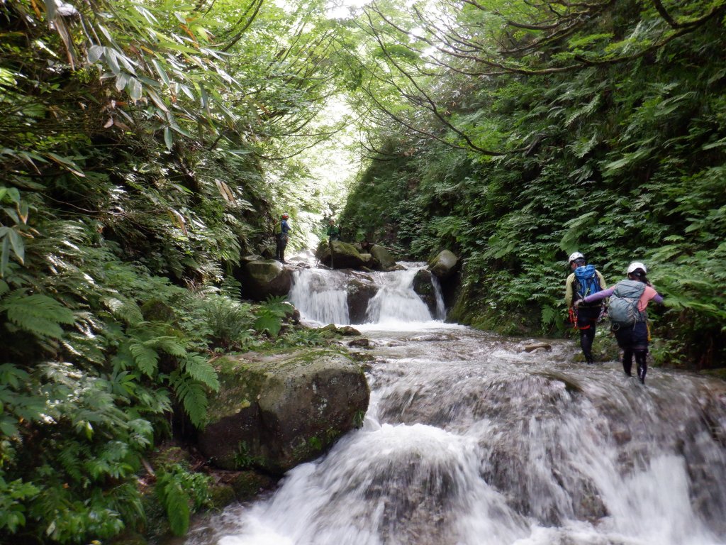 (進藤ま)今回は進藤みのリハビリを兼ね、この梅雨の雨ばかりの時期の中で降らなそう~って言う天気予報を信じ優しい沢と言われている五頭の小倉沢へ行ってきました。前日の朝に急遽行く事を決め、参加希望を所属する山岳会の皆さんに募ったらなんと6名の参加希望が!私達を含め8名でいざ出発です。当日五頭山の駐車場へ着くとポツポツと雨が…「もうこれ以上降らないで~」と祈りながら出発。思いのほか水量が多めだったようでやさしい沢ではなく迫力のある沢へと変貌していました!そんな中で登り方など色々と試せてすっごく楽しかったです。さらに今回は沢靴を「ハイパーV」を試してみました!赤っぽい苔は気持ち滑りましたがフェルトより滑らなかったと思います。ただハイカットではないので砂が靴の中に溜まりました。小倉沢は近くて楽しくて藪漕ぎも無く…これからはアブ等が怖いですが時期を見てまた行きたいと思いました。