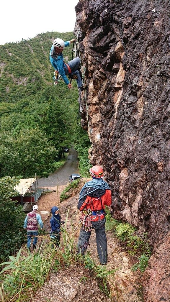 (山宮)昨日と同じく本日もアブミ講習&練習をしました。昨日と同じく雨が降ったり止んだりの天気で杉滝岩左奥のアブミルートでの練習は今日も断念。(杉滝岩左奥のアブミルートでの練習は翌週に個人山行として登ってもらうことにしました。)昨日と同じくキョンシーとランボー1~ランボー2のルートを使い各々たくさん登ってもらいました。