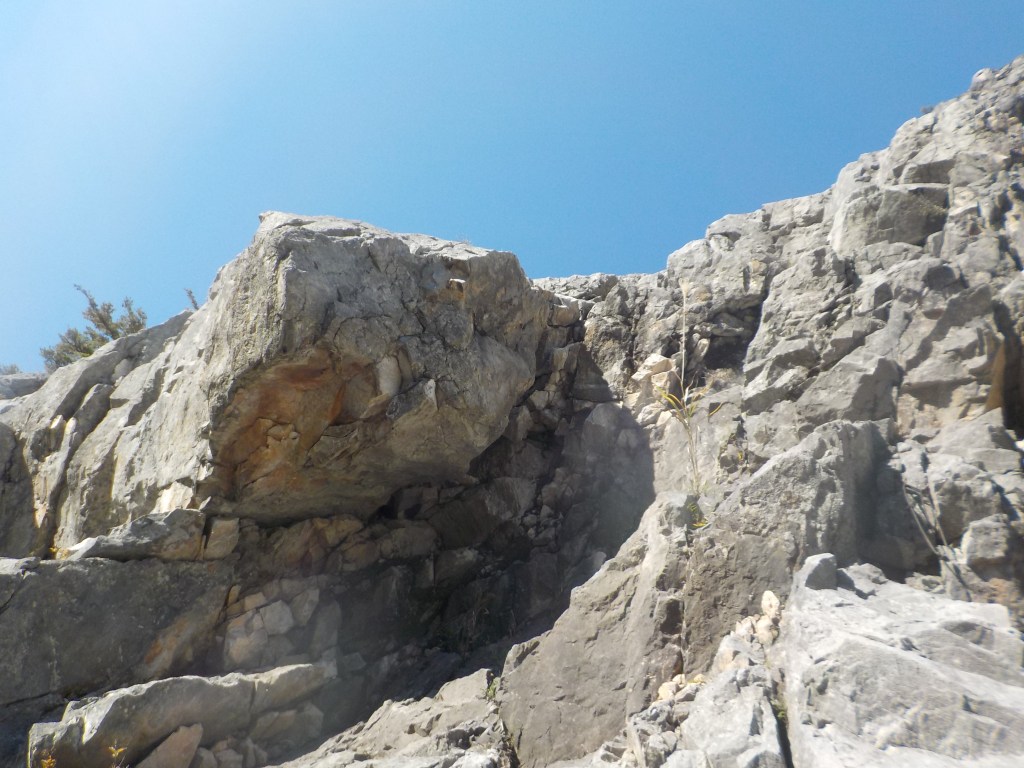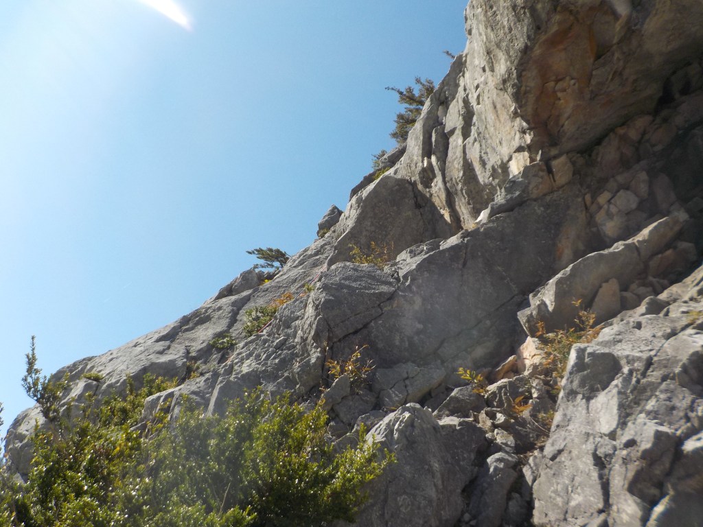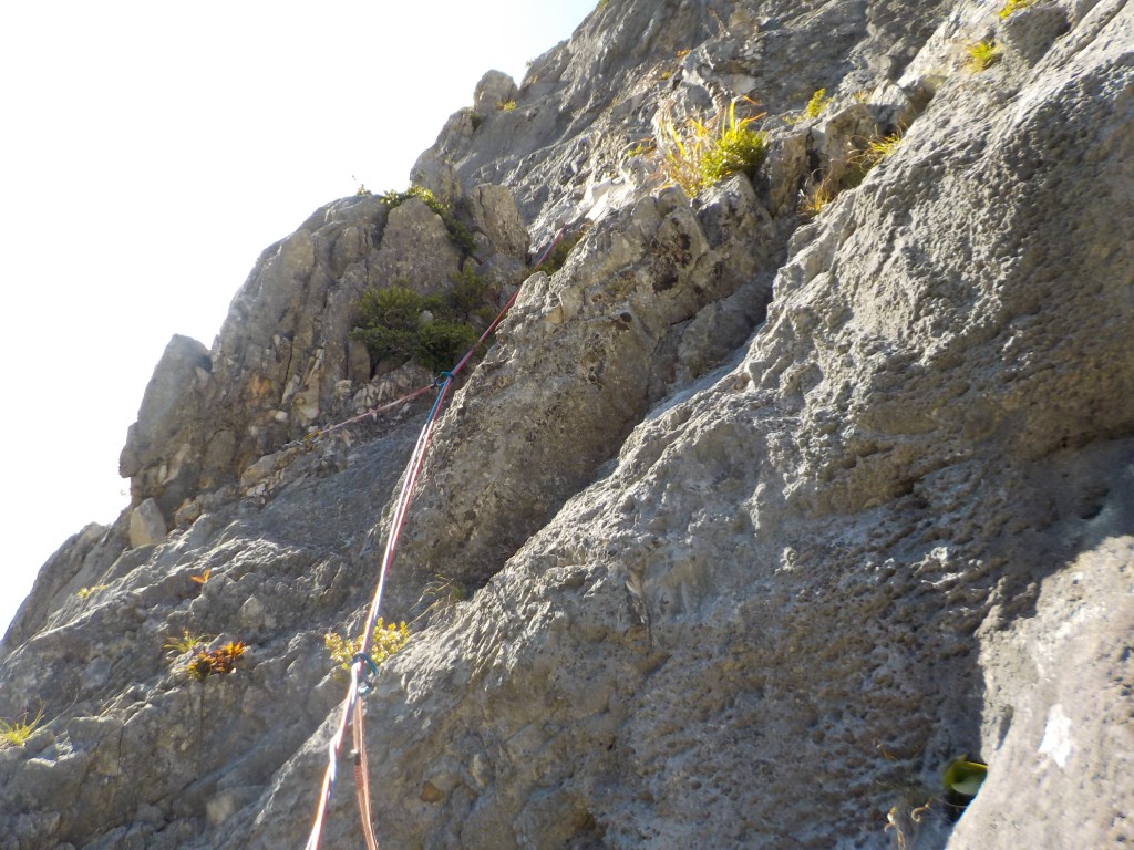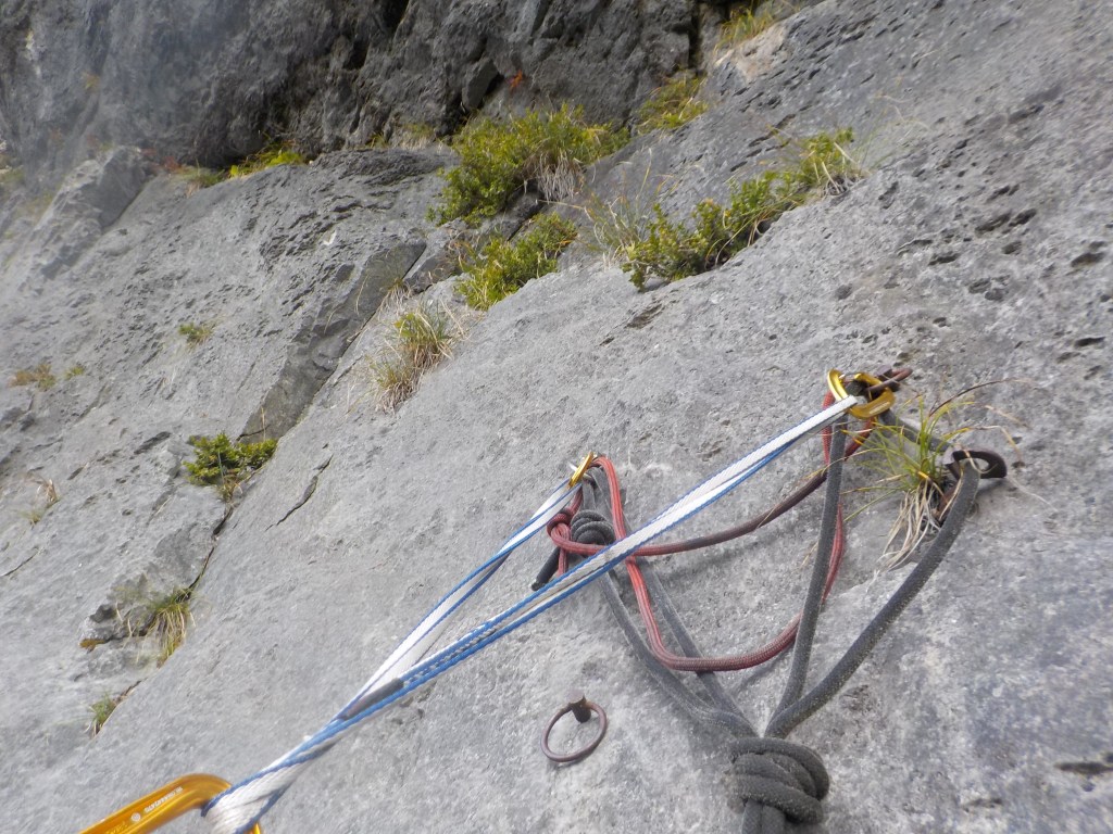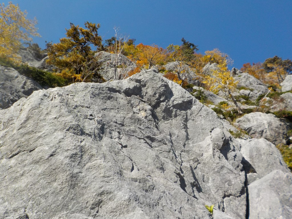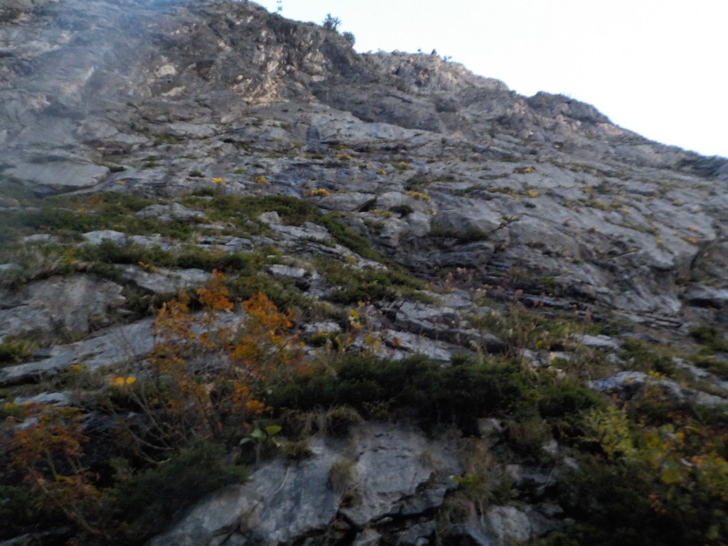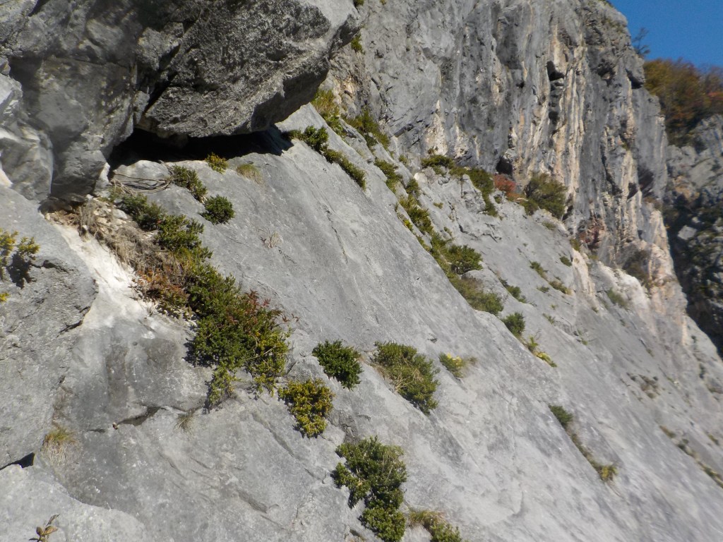 ・凹角を抜けると景色が開けます。右に見えるスラブにはたくさん残置中間支点が見えますがそちらへは迷い込まず階段状フェイスを灌木で支点を取りながら上へ登るとハング帯下に終了点が見えてきます。