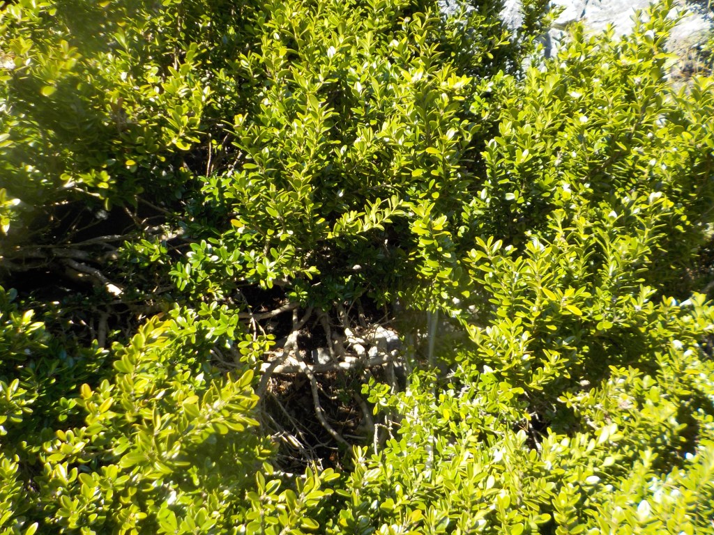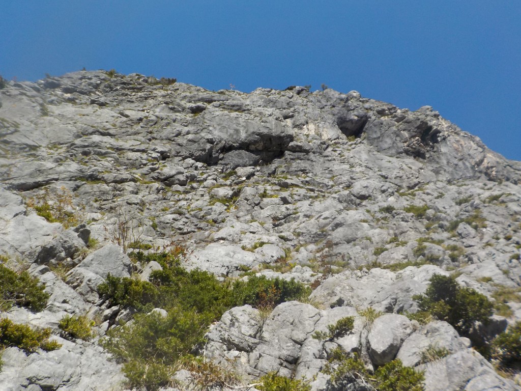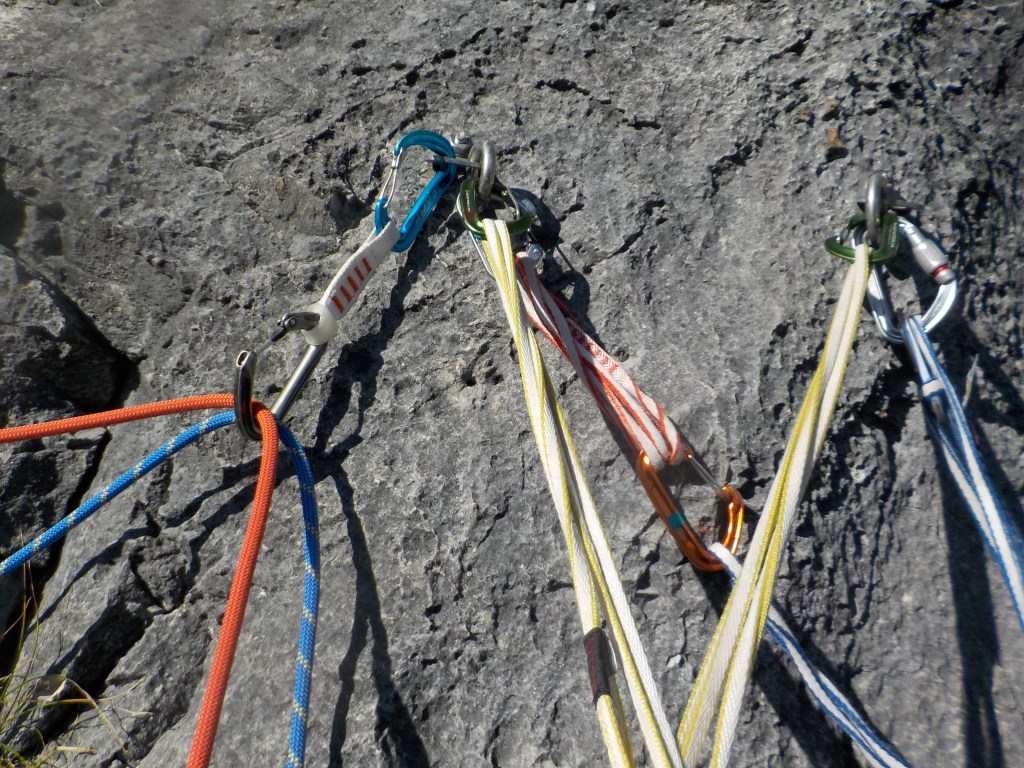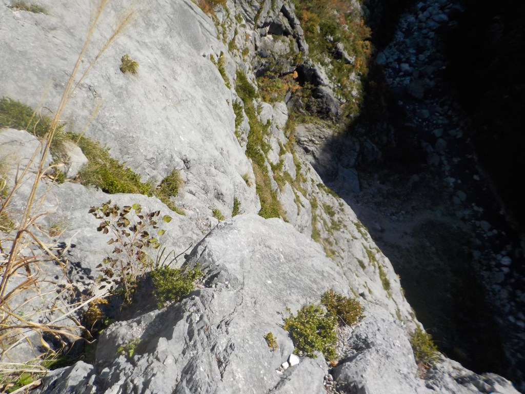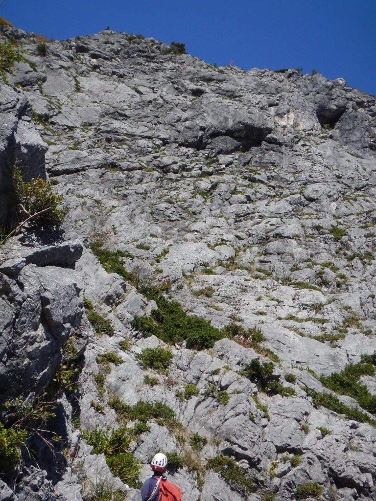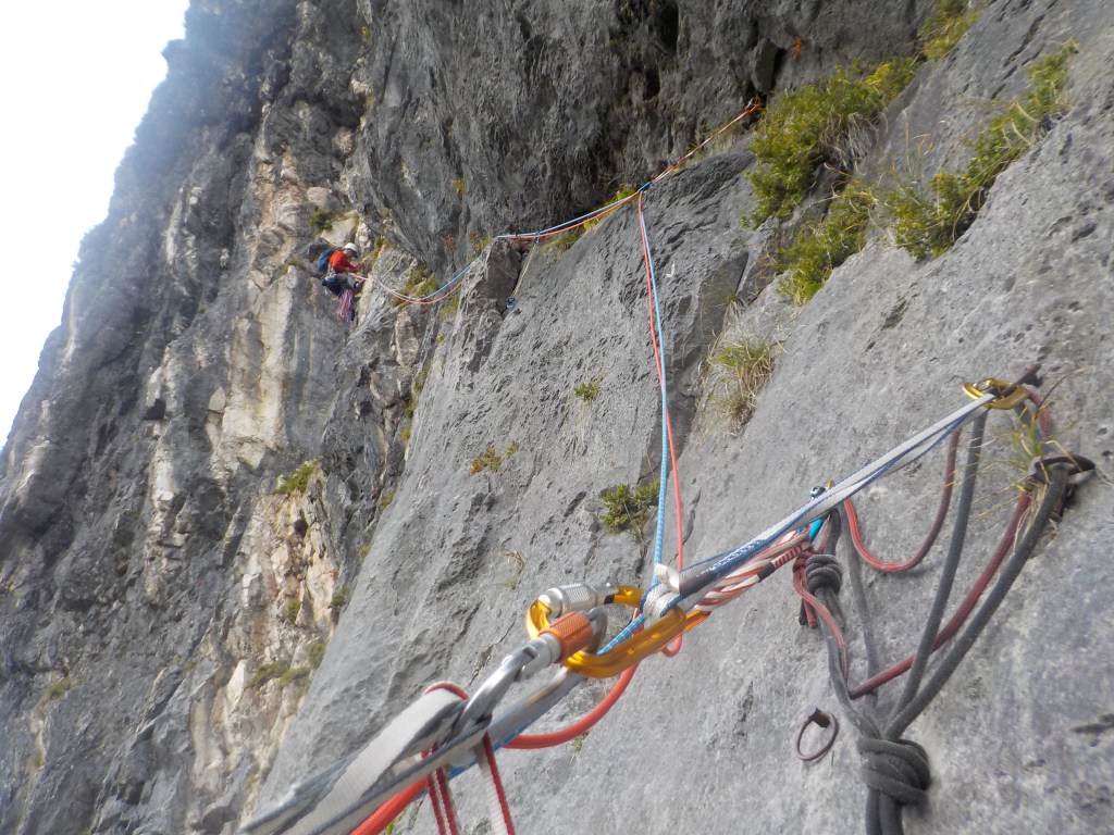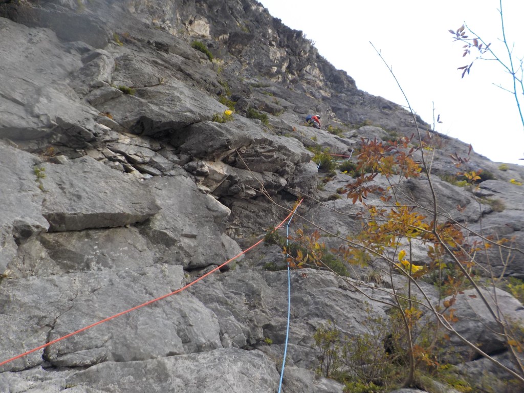・凹角を抜けると景色が開けます。右に見えるスラブにはたくさん残置中間支点が見えますがそちらへは迷い込まず階段状フェイスを灌木で支点を取りながら上へ登るとハング帯下に終了点が見えてきます。