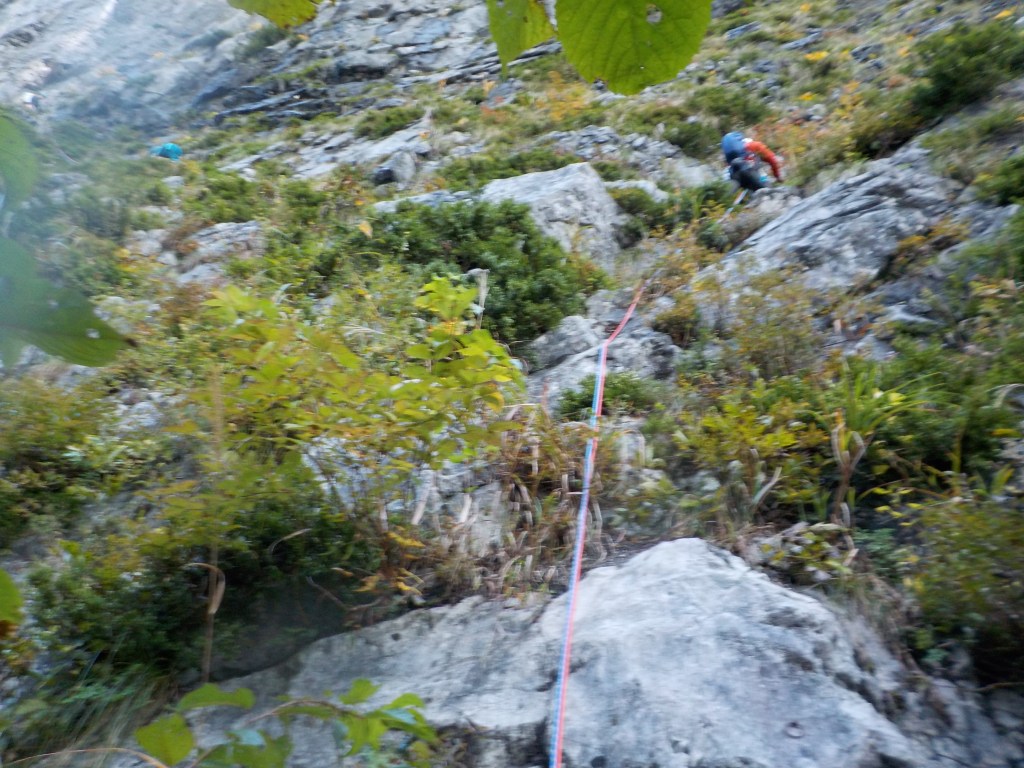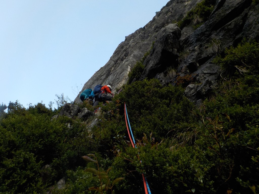 ・残置終了点は見当たらず灌木で取りました。(凹角を抜けてすぐのところでピッチを切りました。)