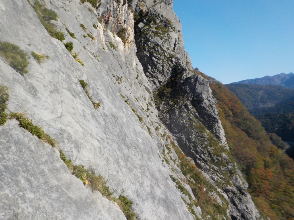 ・凹角にあるウメボシ岩を左から越えてバンドへいくとバンドには支点が取れる灌木が1箇所だけあり(もう1個所の奥の灌木は抜けそうな状態でした。そこにも残置スリングあり。)長めの残置スリングがありました。その残置のスリングを使いながら(片手はバンドを持ちスリングに全荷重かからないよう注意しました。)1段下のスラブへ下りてトラバースしました。
