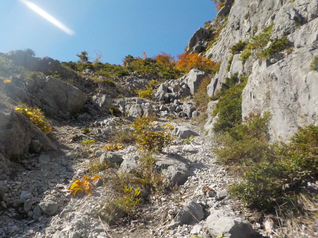 ・中央バンドのガレ場を左上して適当なところから一段上のテラスへ登りました。
