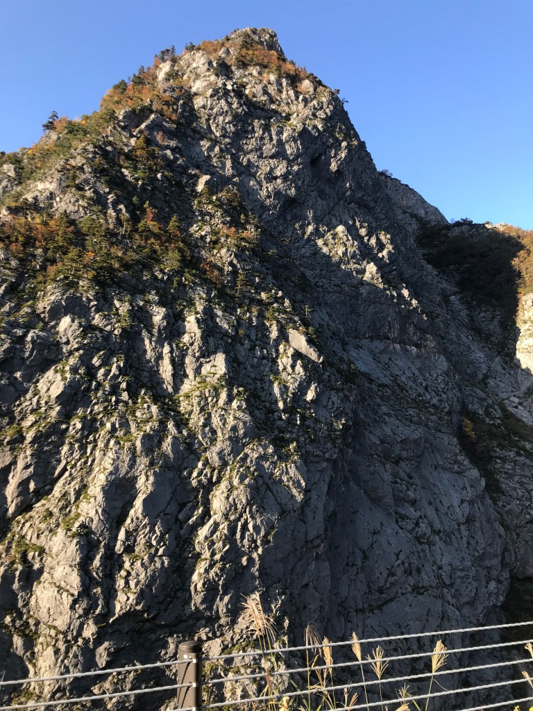 ★感想:朝起きると駐車場の舗装が濡れていて嫌な気分に・・・とりあえず取付まで行ってみて様子を見ようと予定通りに出発して取付には2番手で着きました。状態が悪ければ今日は登らず日曜日に登攀することも考えましたが何とかなりそうなので予定通り登ることにしました。取付で3人組の先行パーティーから先にどうぞと言われたのですが準備も終わってなかったので先行は遠慮させてもらいました。2P目終了点で再び先にどうぞと言われたので先を譲ってもらいました。ありがとうございました。思いがけずこの日の先頭に立つことになったのでルートを間違わないよう注意しながら登りました。(1箇所だけ終了点を間違って次のピッチを違うところを登ることになりそうでしたが、すぐに気づいて修正できてよかったです。)序盤は濡れた石灰岩にフラットソールが滑るので不快なクライミングが続きました。5P目からは岩が乾いていて滑ることを気にせずに快適に登れました。西面下降路への道があるバンドへは迷わずクライムダウンで下りれて良かったです。先々週に左岩稜を登っていて見覚えのある景色が見えたので不安なく下りれました。全体的に岩がもげないかどうか気を使いながらのクライミングになりましたが、久しぶりの緊張感が心地良かったです。最近アルパインは敗退続きでしたが久しぶりに完登できて良かったです。