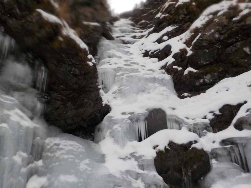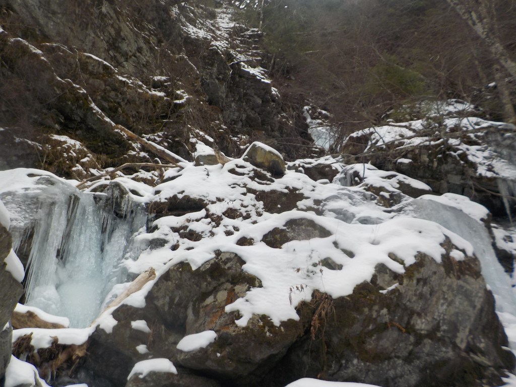 ①ヘッデン下山だったので特に注意して下ってはいましたが氷の薄いところで踏み抜きドボン・・・転んだ勢いでアックスを雪の中に落として探すのに苦労しました。(周りの雪の中に片方のアックスが見当たらずドボンした水の中に手を突っ込んでしばらく捜索しましたが見つからず諦めて下ろうとしたところ、Tさんが1段下に下りた雪の中から見つけてくれました。ありがとうございました。)