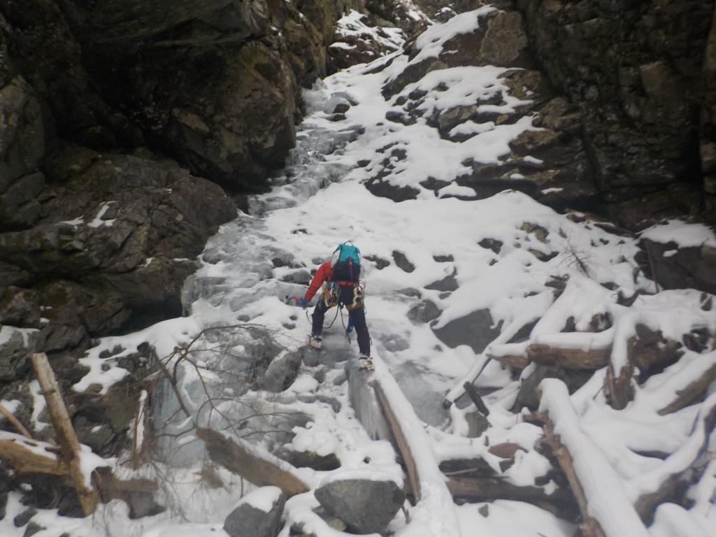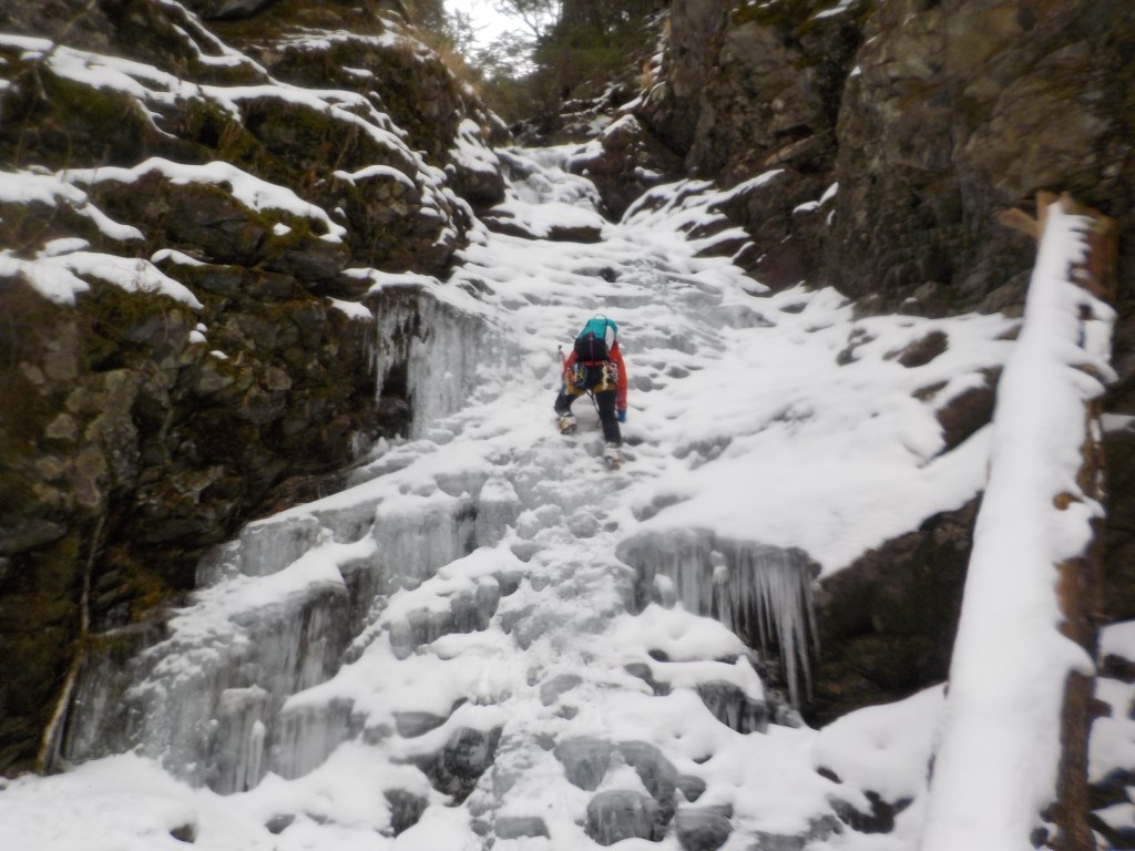 ・塩沢二俣から右俣を詰め、F1基部でアイゼン装着、ダブルアックス、アイススクリューをザックから取り出しアイスクライミング装備で登攀開始。