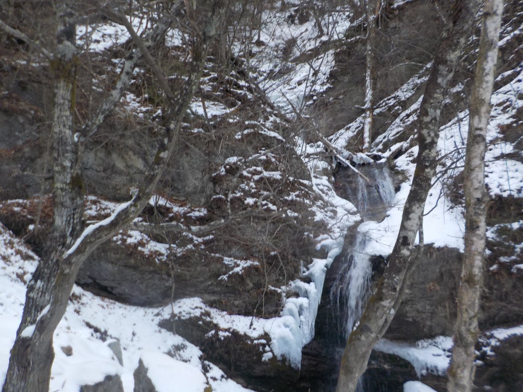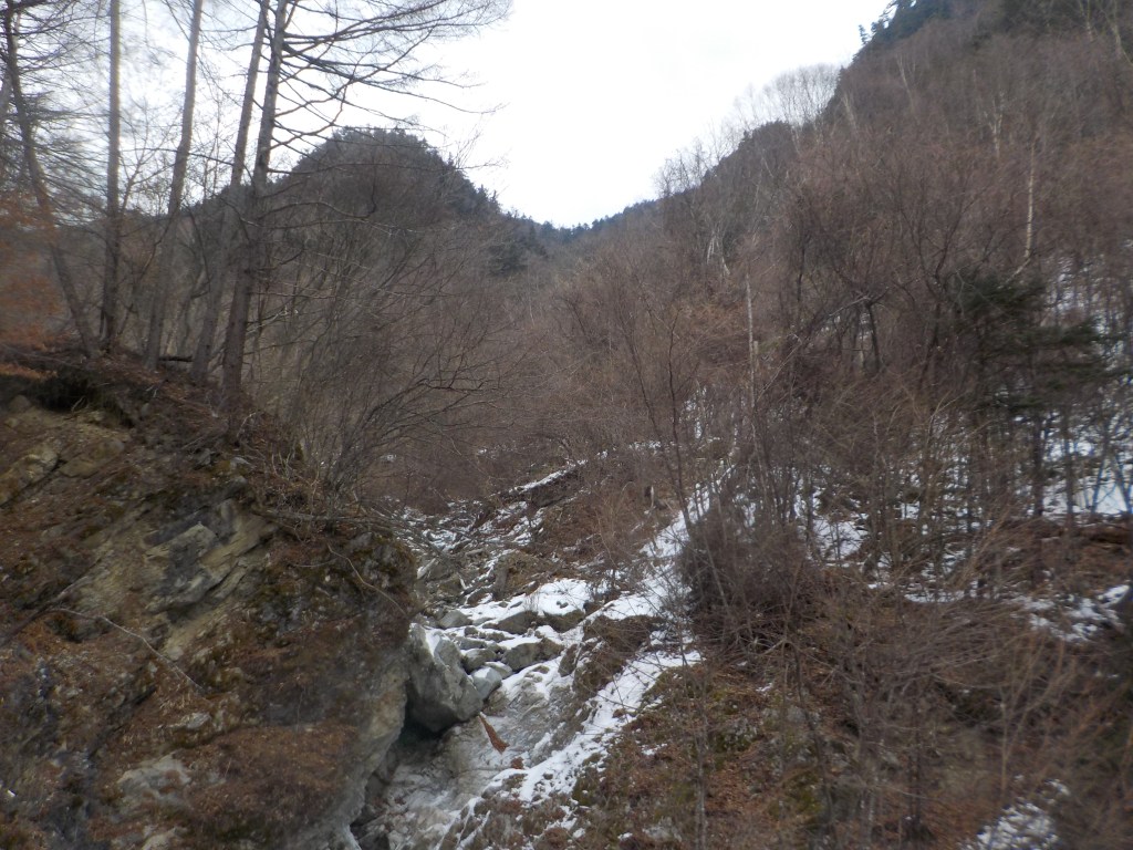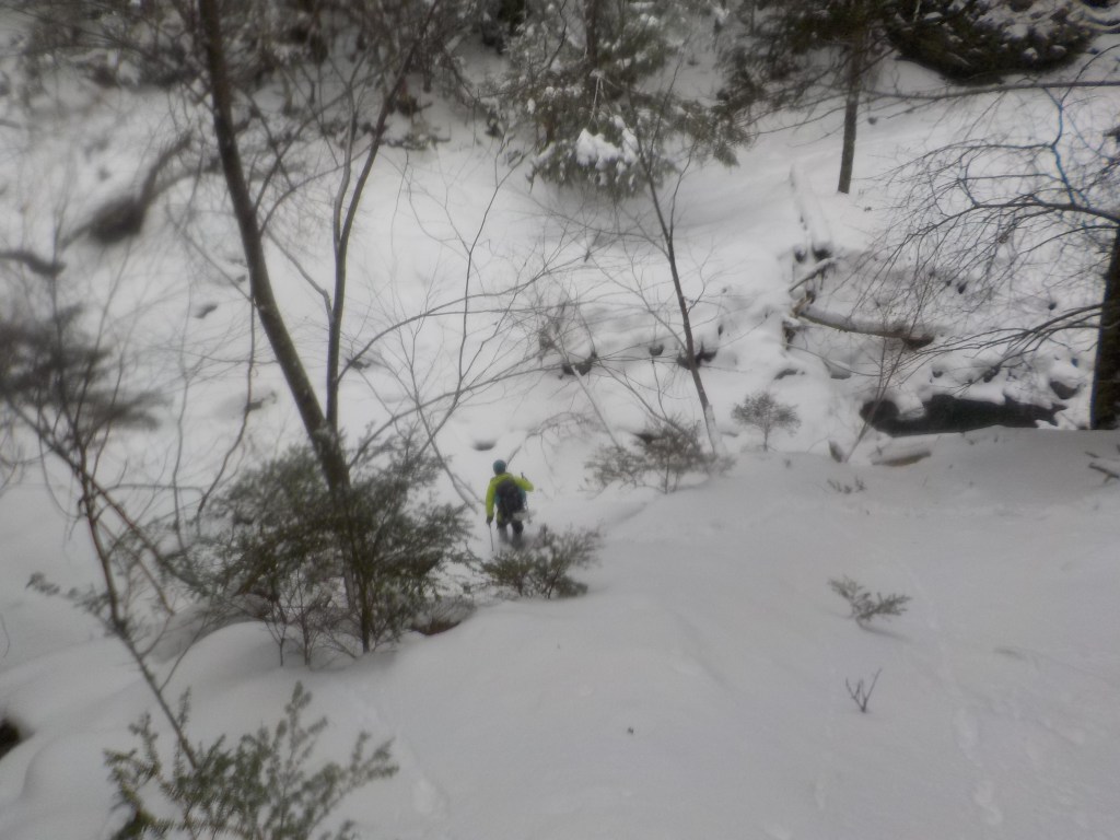 ・岳沢越えへの沢筋の登りはできるだけ沢内を詰めず右岸の尾根筋を歩きました。氷結した滝が出てきたところは出だしを右岸の尾根から巻いて途中で沢を横切りその後は左岸の尾根を使って岳沢越えまで登りました。(下山時は登ってきた左岸の尾根は使わずに上から右岸の尾根筋を使って下りました。)