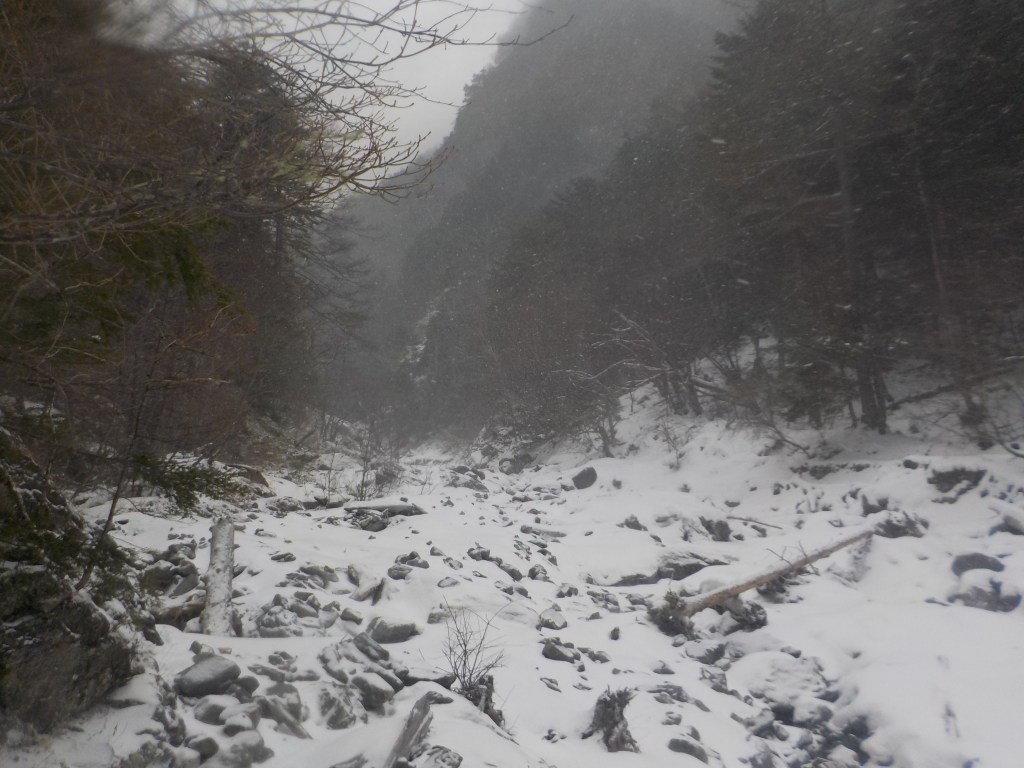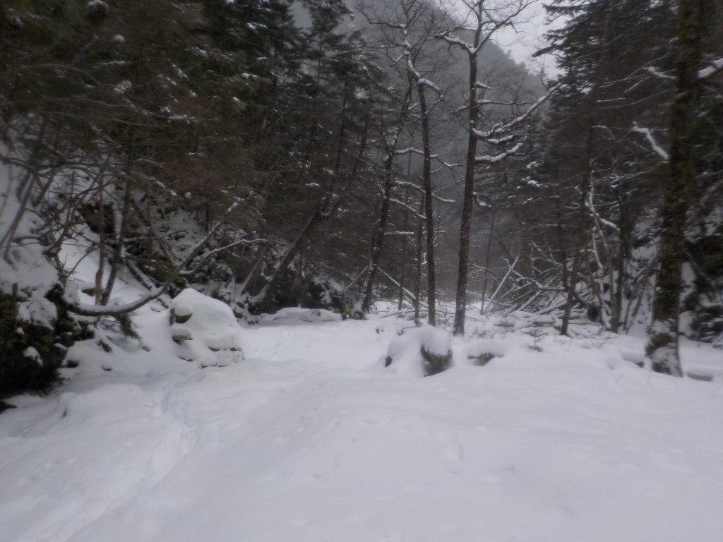 ②三峰川へ下り立った地点から岳沢出合まで膝下ラッセル・・・前の3連休から一週間で積雪があったと思われ、ここで膝下ラッセルなら岳沢内はもっとあり時間がかかりそうだしF9から稜線へ抜ける区間もラッセルでかなり時間がかかりそう・・・