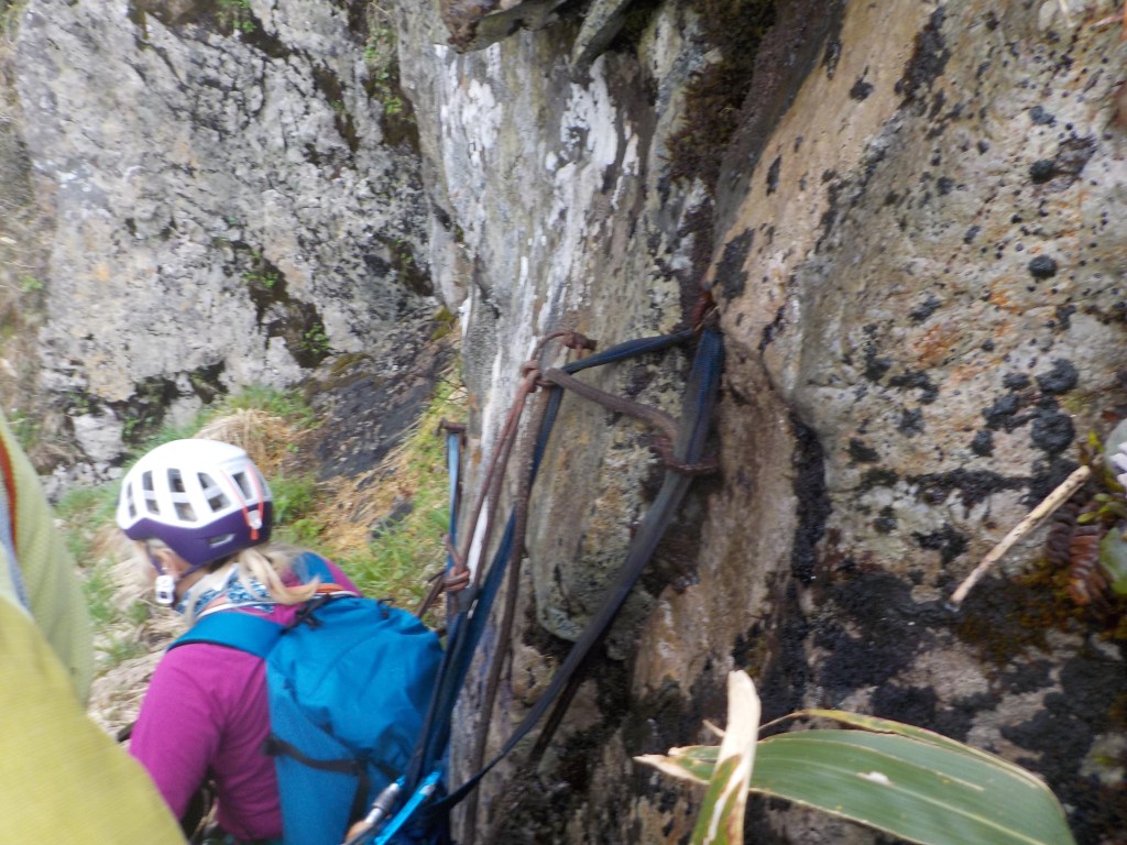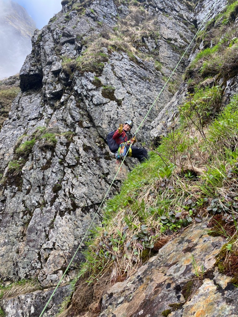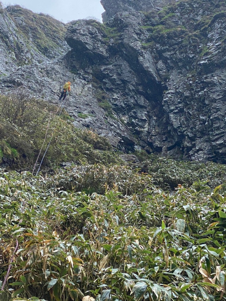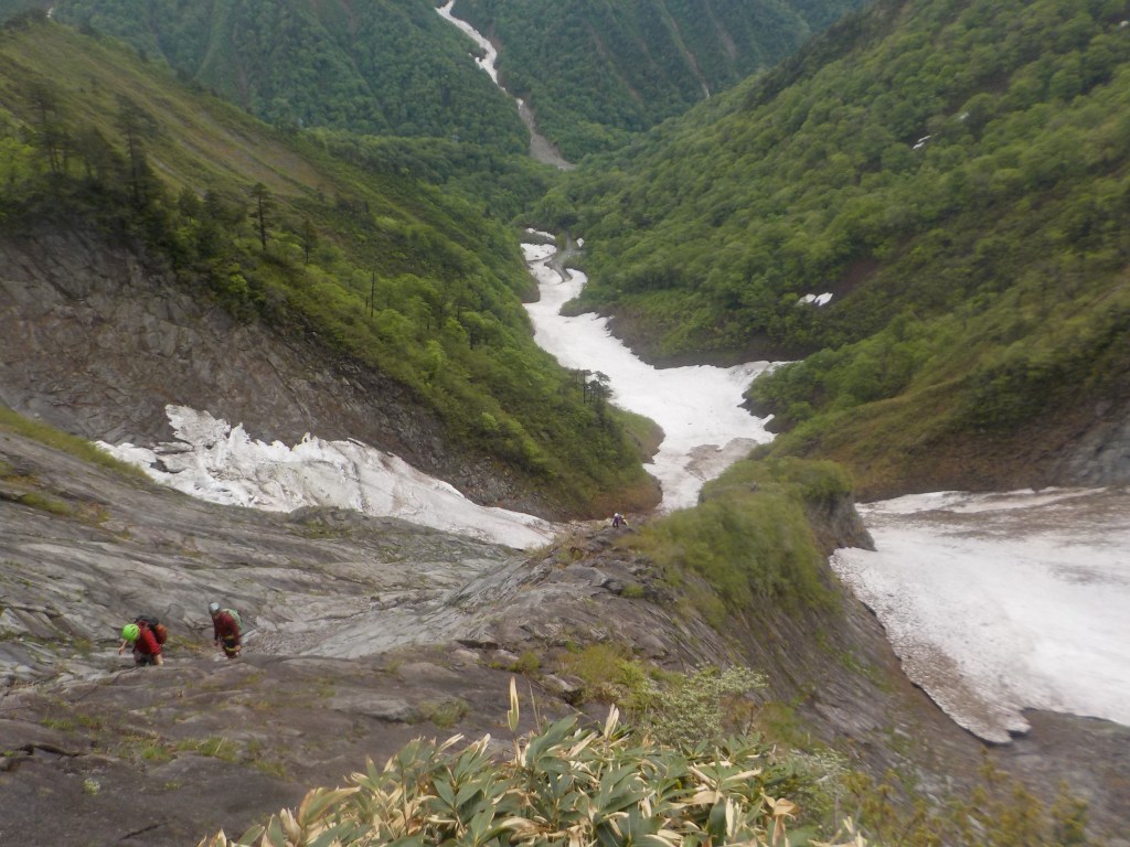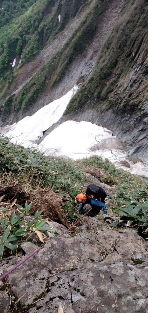 ・烏帽子スラブ横断バンドからは50mロープ1本で1回だけ懸垂下降をして安定したところでロープを仕舞いました。