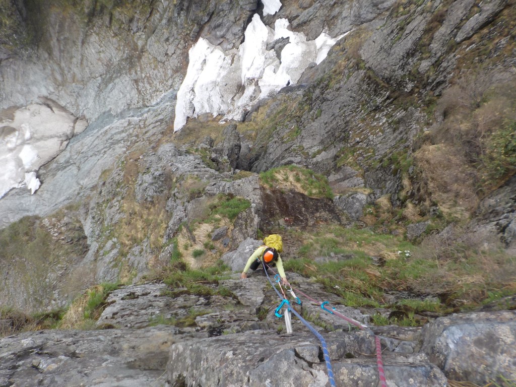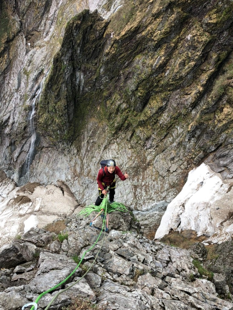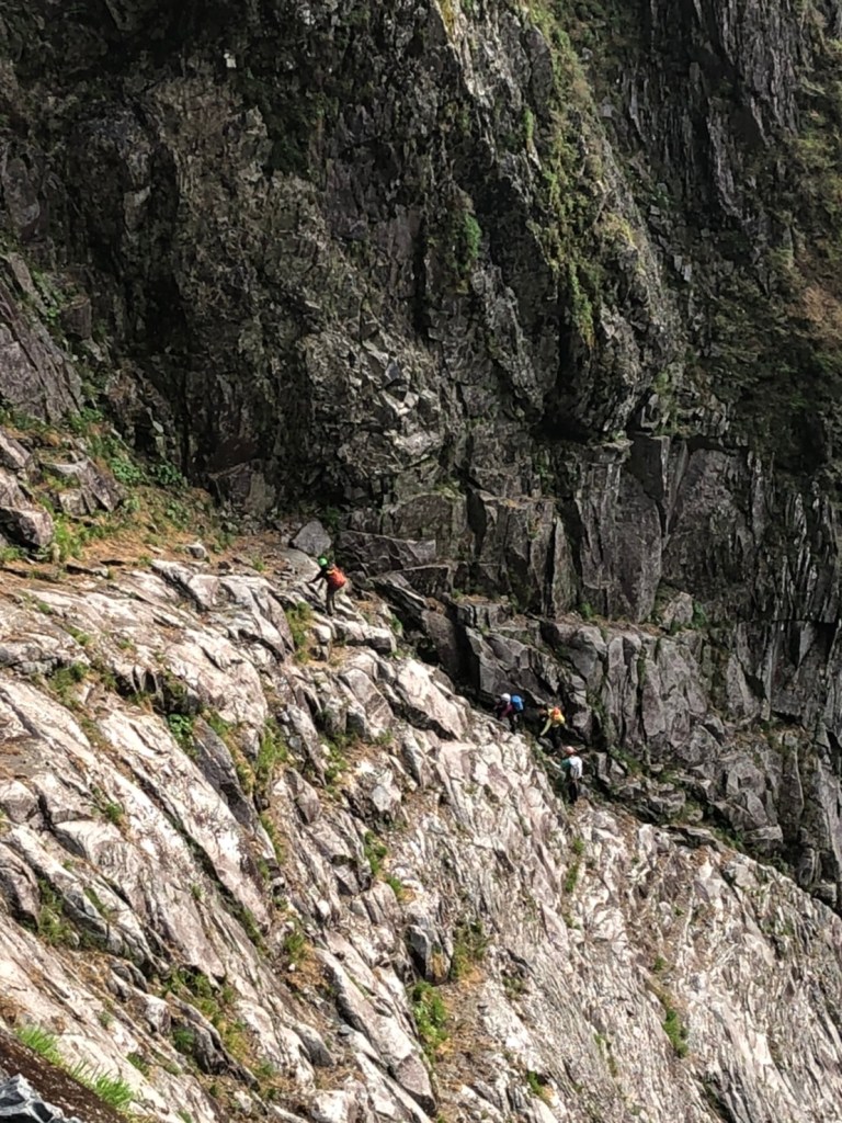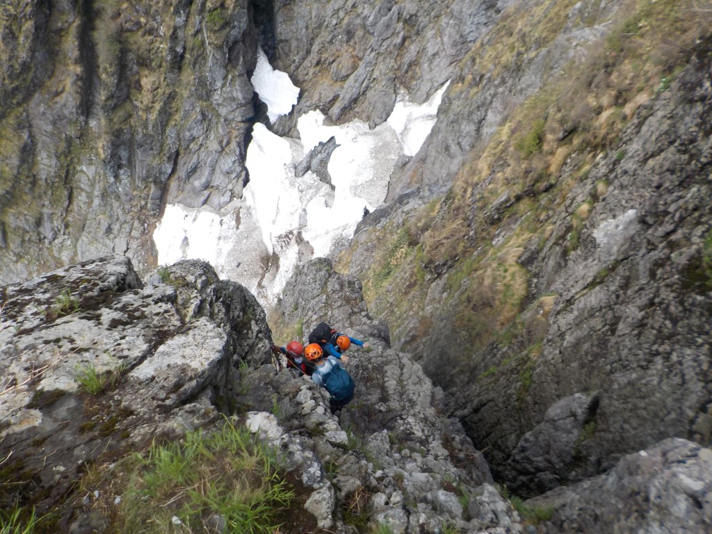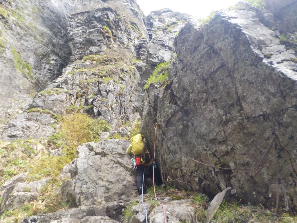 ・烏帽子スラブ横断バンドからは50mロープ1本で1回だけ懸垂下降をして安定したところでロープを仕舞いました。